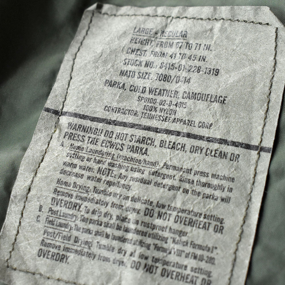 “Extreme Cold Weather Clothing System”の名の通り、極寒地用に開発された実用本位のミリタリーアウター。ウッドランドカモのナイロンシェルは、荒野や森林地帯に溶け込むことを目的としながらも、ファッションとして見ると圧倒的な存在感を放ちます。