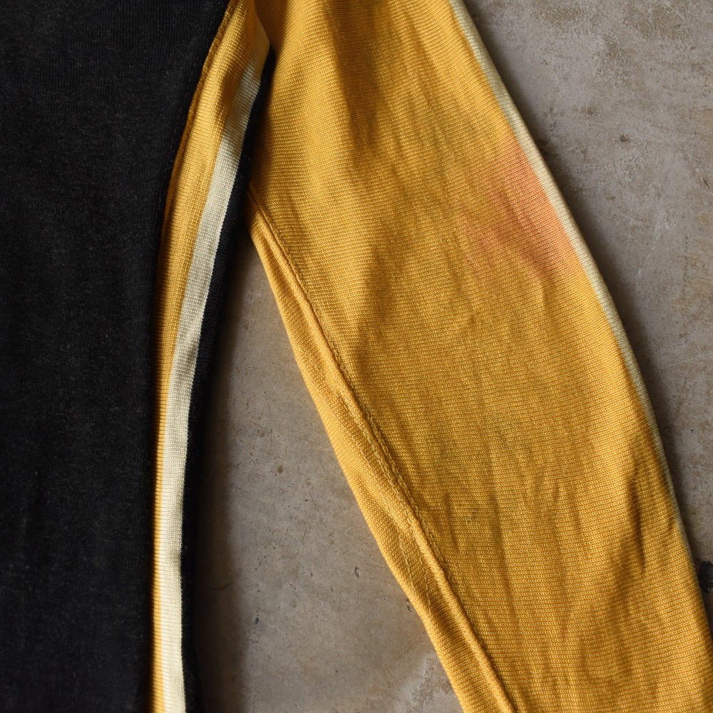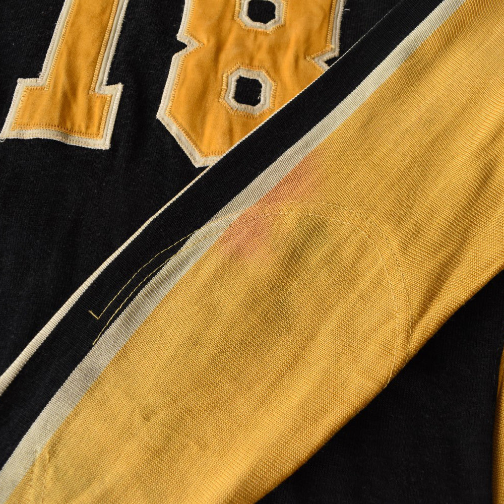 素材はいわゆる後年のコットンジャージとは違い、当時らしい光沢のあるジャージ生地です。伸縮性はほとんどなく、少しテカりのある表情。レーヨンやアセテート系が主流だった時代の、いかにも古いスポーツウェアの質感がそのまま残っています。