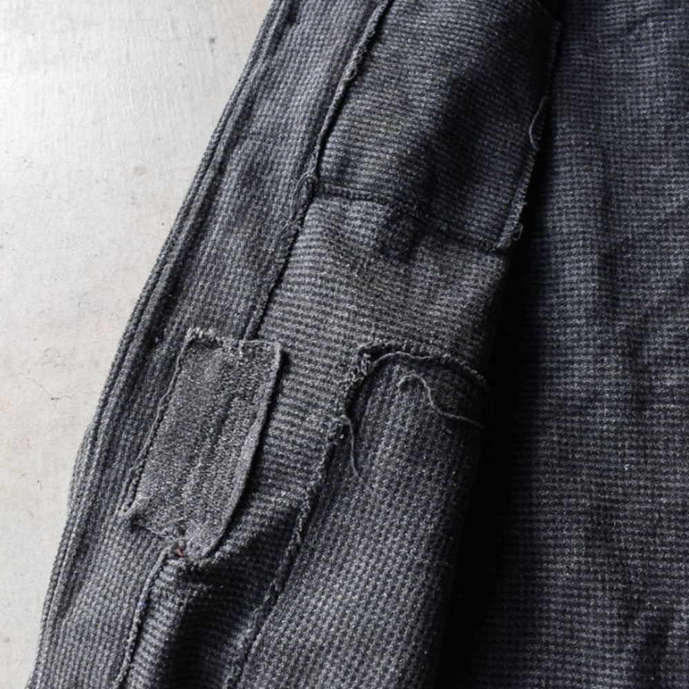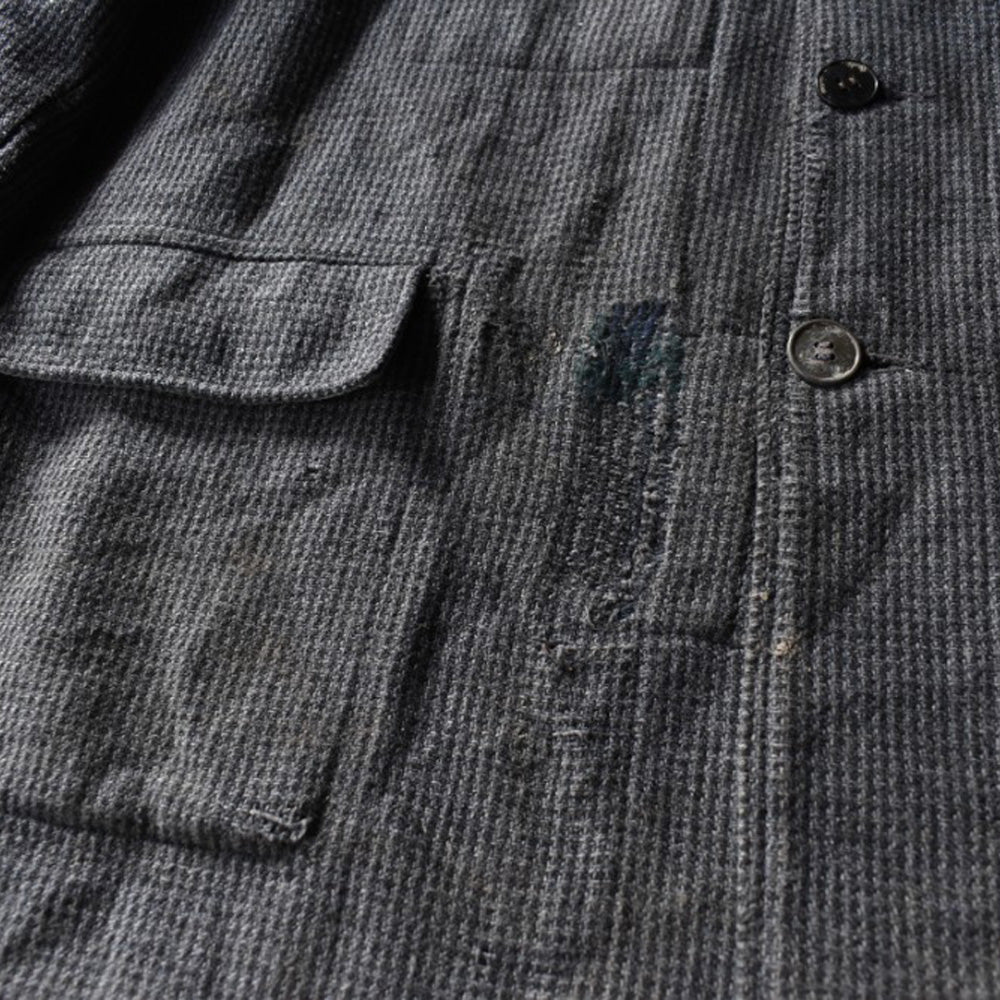 この時代のフレンチワークは、現存数も少なく、特にここまで自然なBOROの状態を保つものは稀少。朽ちかけた生地の風合いや、手仕事による修繕のリズムが、単なる古着を超えてアートピースのような存在感を放ちます。