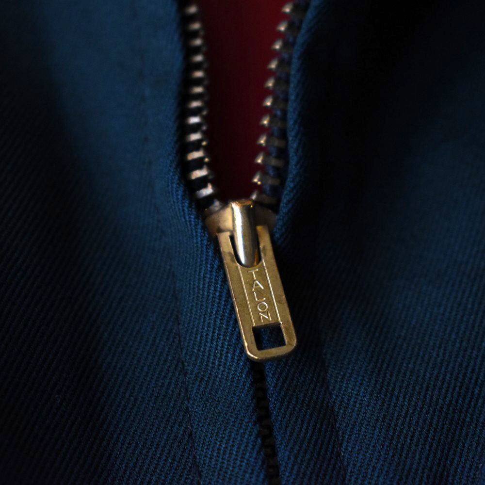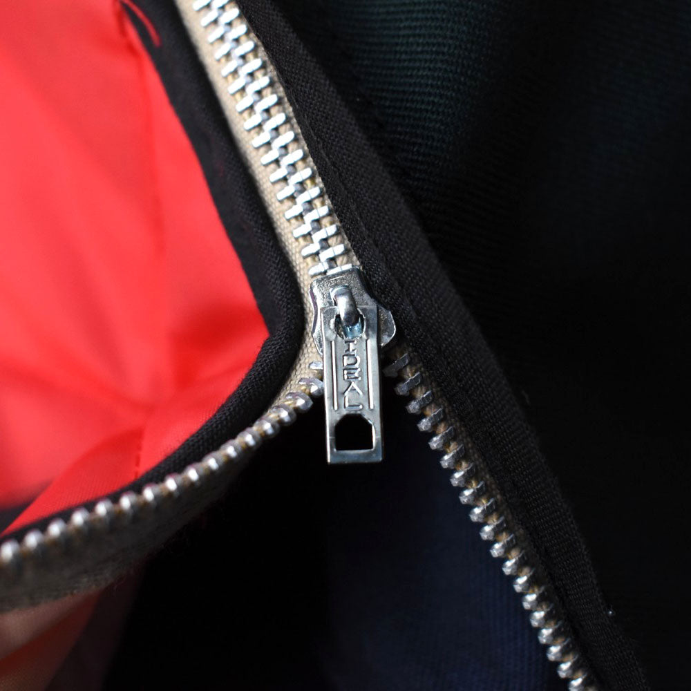 Riversideのタグ、TALONとIDEALのZIP、無地のフラップポケット。