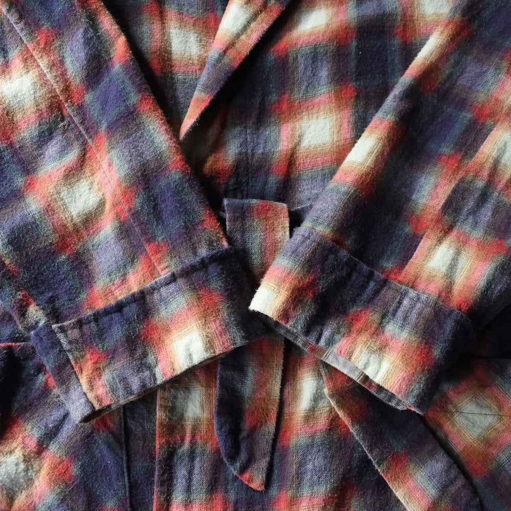 赤、紺、生成りが溶け合うようににじんだシャドーチェックが美しく、ネル地特有の毛羽立ちと柔らかさが時間の経過を感じさせます。ゆるやかに肩が落ちるシルエットに、腰ベルト付きのリラックスしたデザイン。