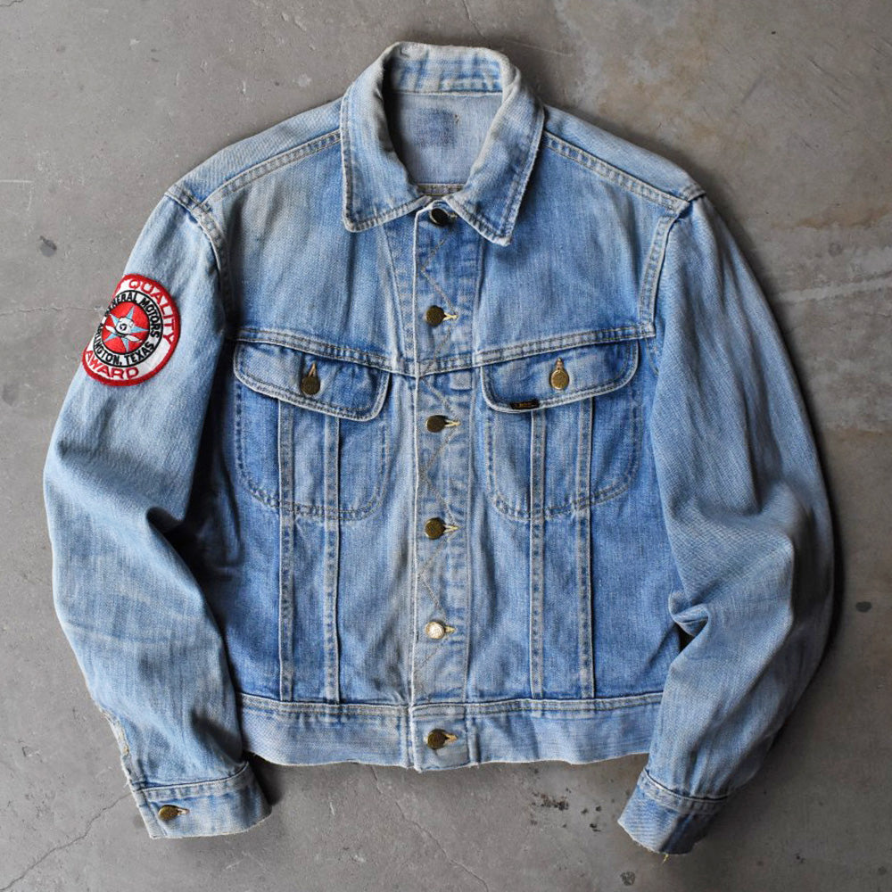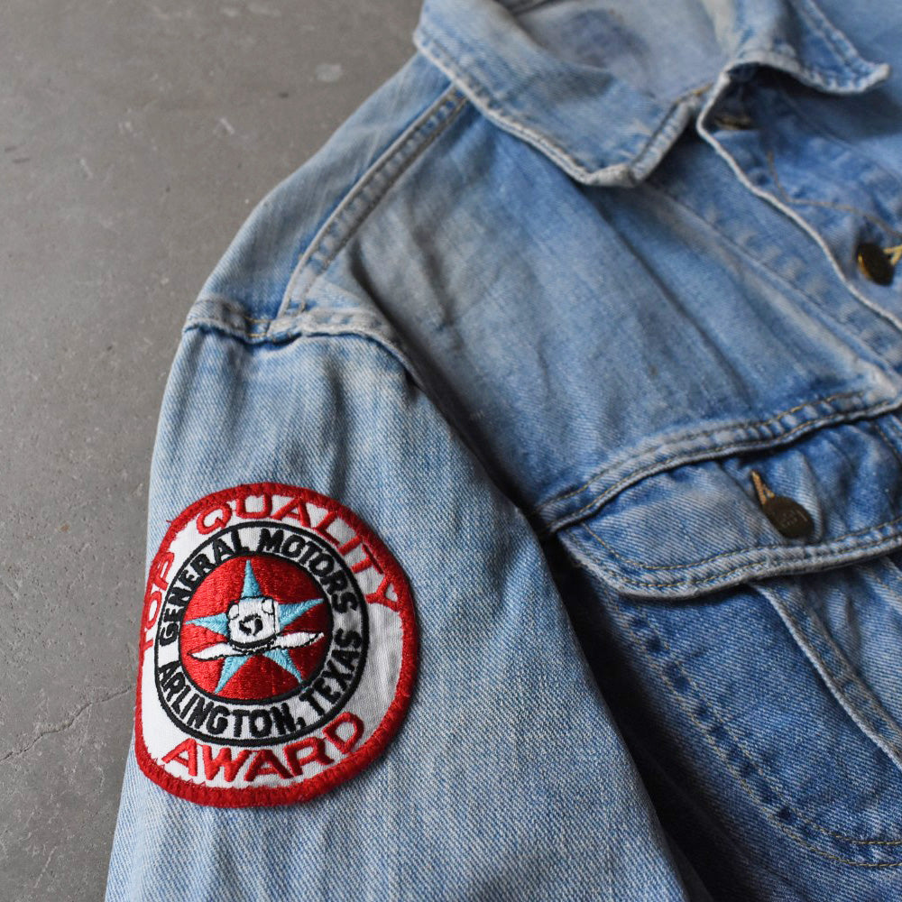brand... Lee date...1970 measuring_size...48cm/53cm/55cm/61cm (Shoulder width[肩幅]/body width[身幅]/Body Length[着丈]/Sleeve Length[袖丈]) condition...シミ、汚れ。スレ、小穴。襟元リペア跡。タグ欠損。着用感。 note... 70年代の Lee 101-J をベースにしたカスタムの一着。 袖には General Motors Arlington工場 “TOP QUALITY AWARD”、背中には WHITE TRUCKS の大判パッチ。 どちらも現場で実際に使われていたタイプで、ワーカーの体温ごと受け継いだような説得力があります。