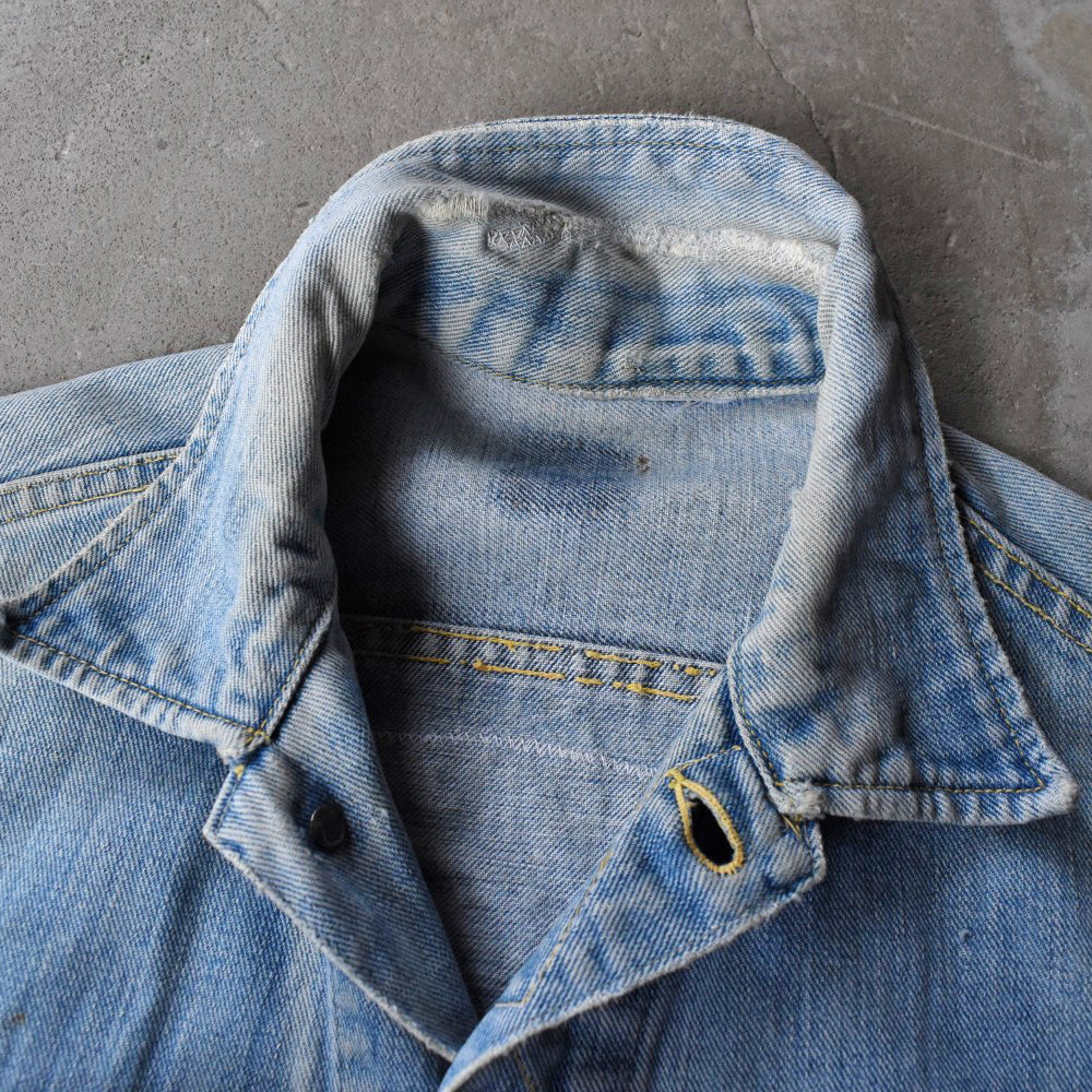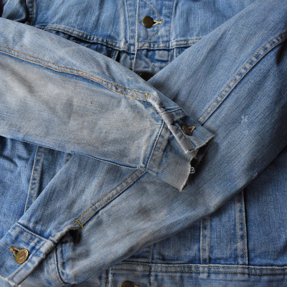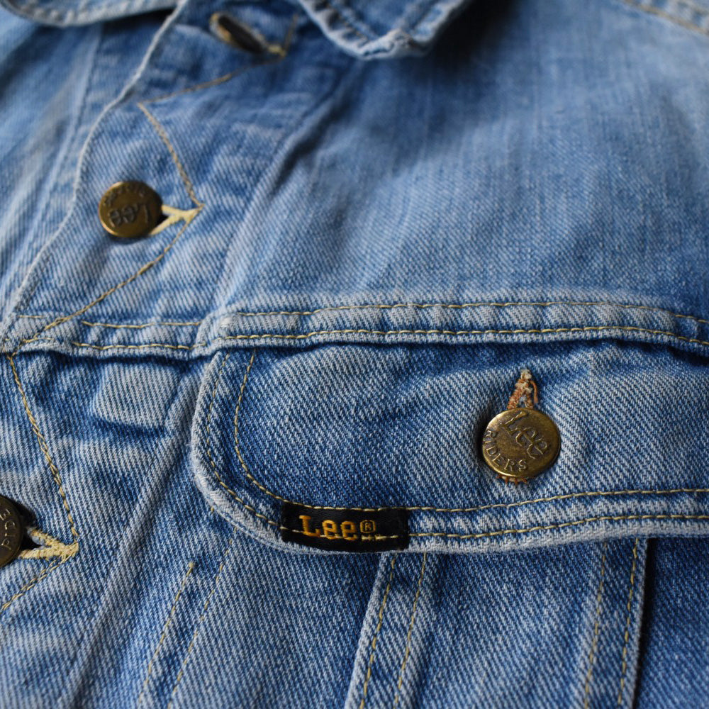 色落ちは、古い Lee だからこその淡いブルー。 縫い目の濃淡、イエローステッチ、肩から袖にかけての自然な削れ、ボタン裏のアタリ。 どれも狙って出せるものじゃなくて、長い年月をかけて 服が育った跡”がそのまま残っている。