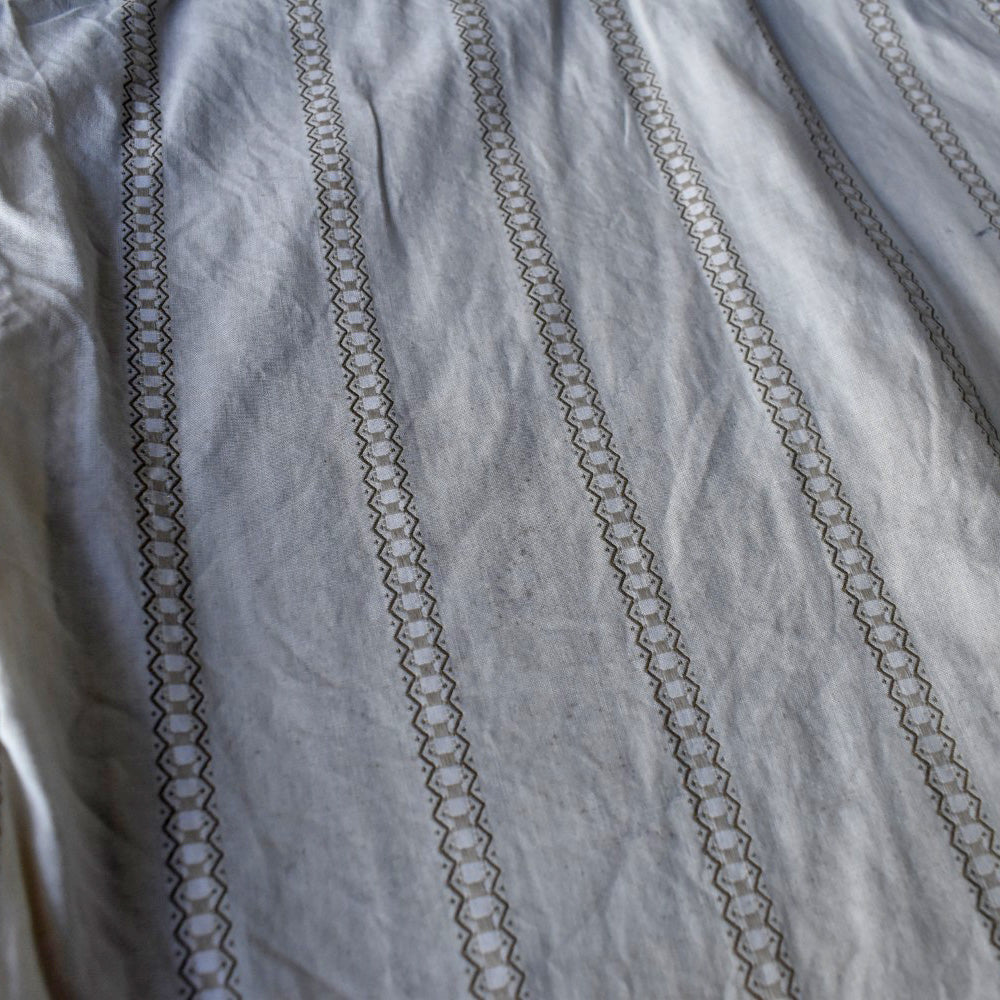 生成りに近い白に、細かく走る刺繍、控えめなヨークのカーブ。