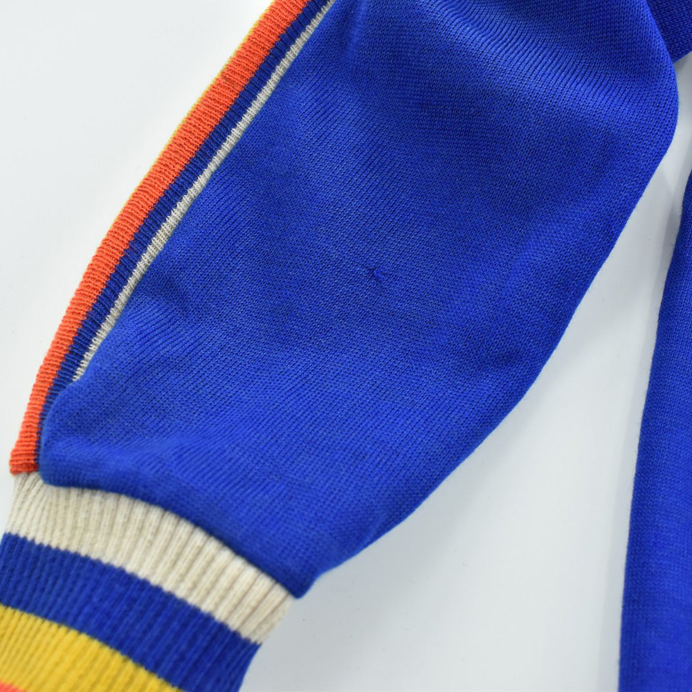 鮮やかなロイヤルブルーのボディに、赤、黄、生成りのマルチカラーリブ。