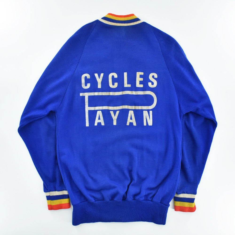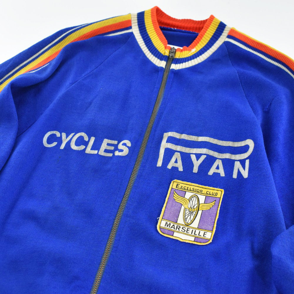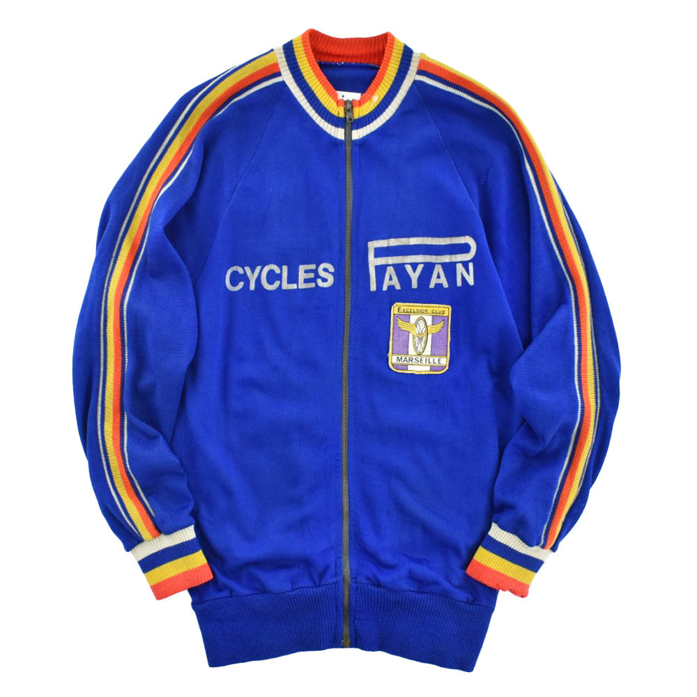 フロントとバックに掲げられた "CYCLES PAYAN" のフロッキープリントは経年によってひび割れ、かつて風を切り汗を流した記憶が刻まれた唯一無二の文様へと変貌しています。胸の "EXCELSIOR CLUB MARSEILLE" ワッペンと深く酸化したECLAIRジッパーが、量産品には出せないヴィンテージ特有の重みを湛えています。