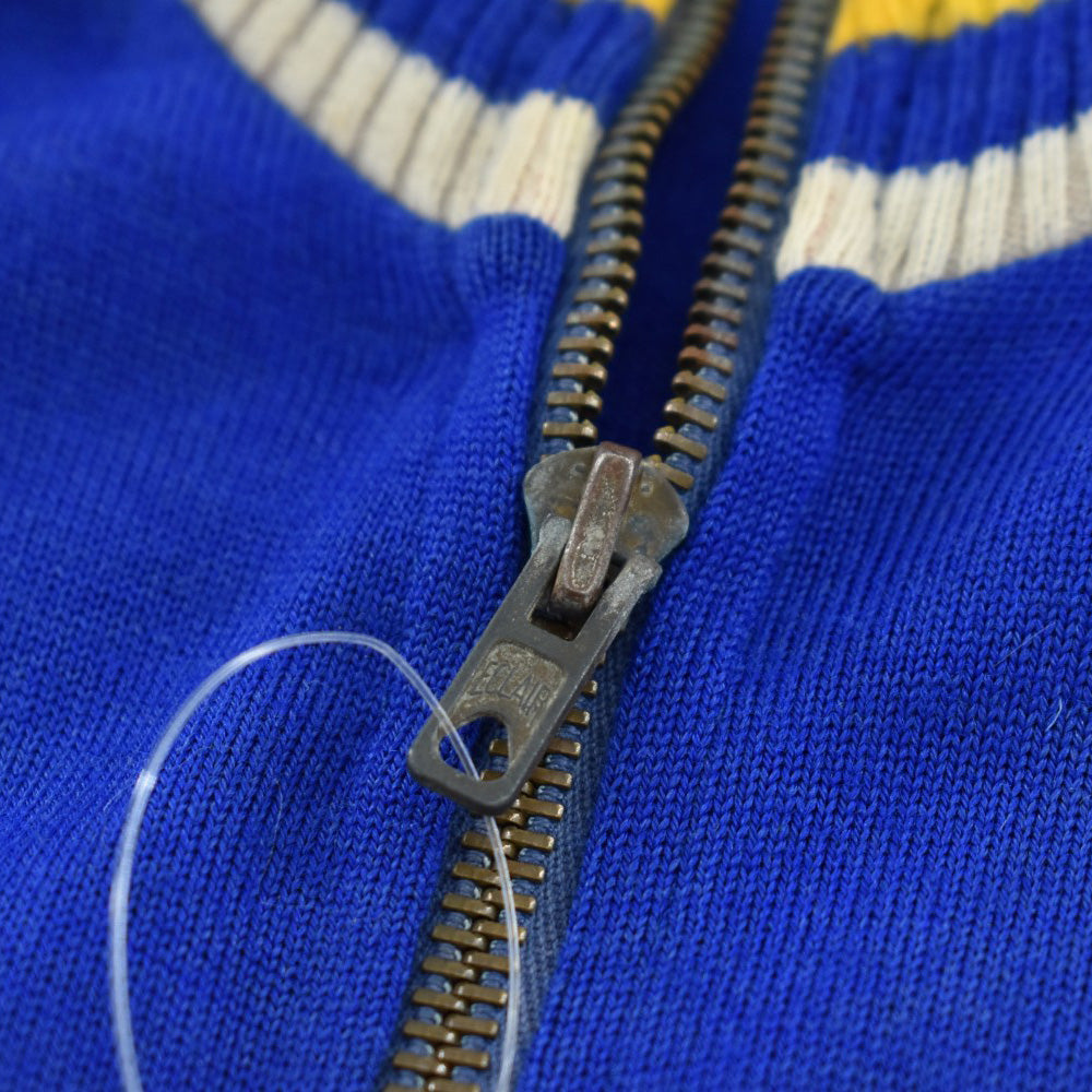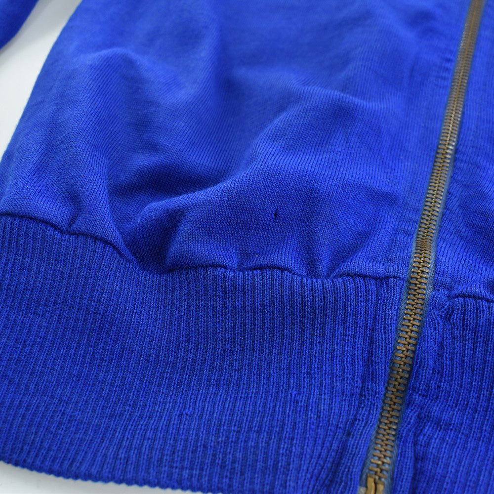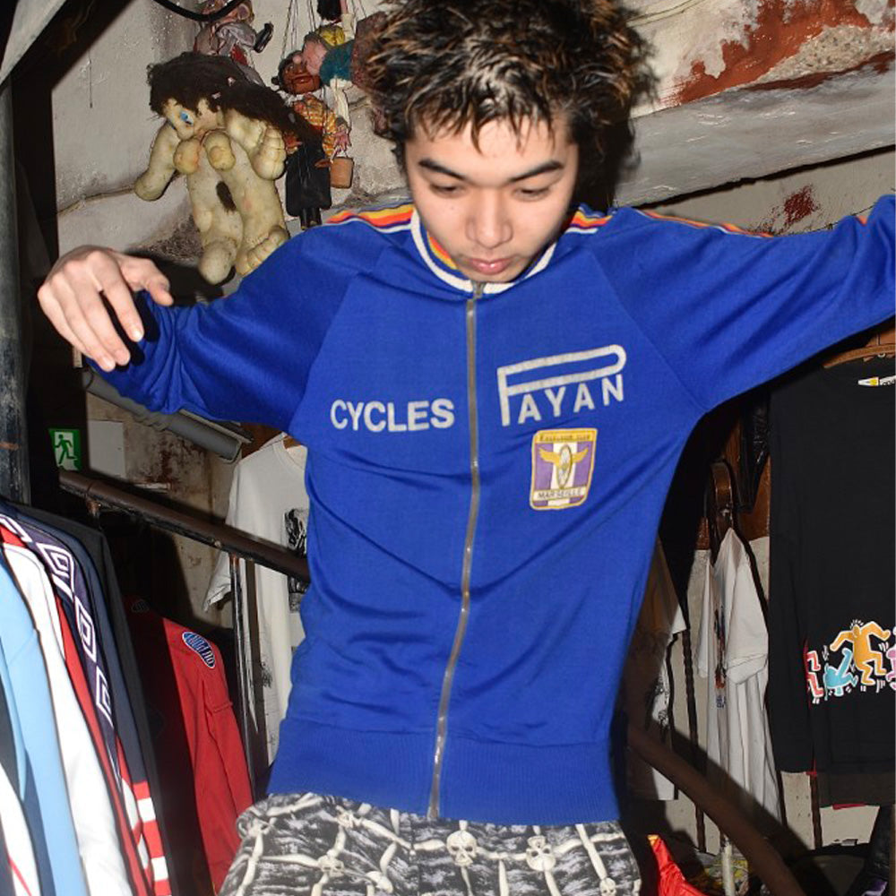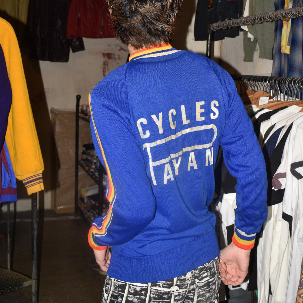 フロントとバックに掲げられた "CYCLES PAYAN" のフロッキープリントは経年によってひび割れ、かつて風を切り汗を流した記憶が刻まれた唯一無二の文様へと変貌しています。胸の "EXCELSIOR CLUB MARSEILLE" ワッペンと深く酸化したECLAIRジッパーが、量産品には出せないヴィンテージ特有の重みを湛えています。