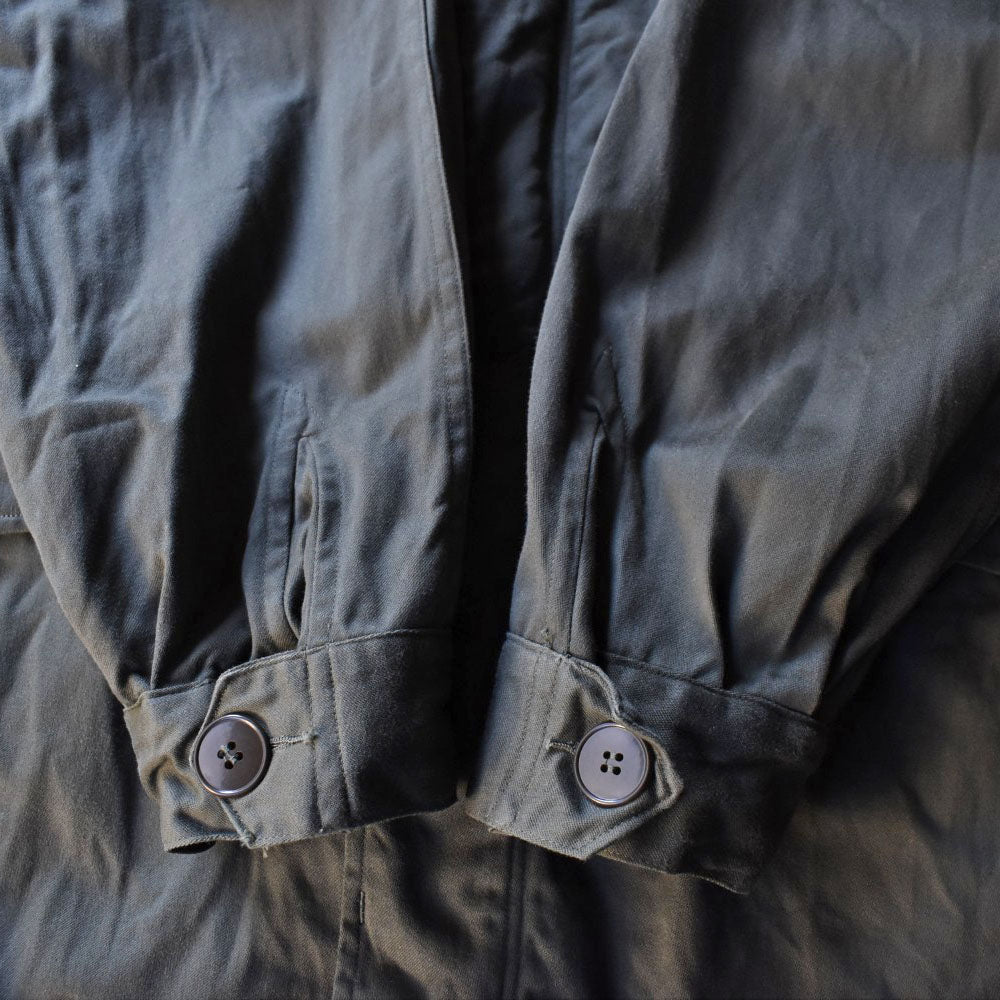 深いオリーブの色味がきれいに育っていて、コットンサテン特有のしっとりした褪色がそのまま表情になっている。古い軍モノにありがちな重たいダメージはなく、素直に日常へ落とし込みやすいコンディション。内側に残るステンシルの黒い影も、静かに存在を主張していて、背景にあった時間をそっと教えてくれる。