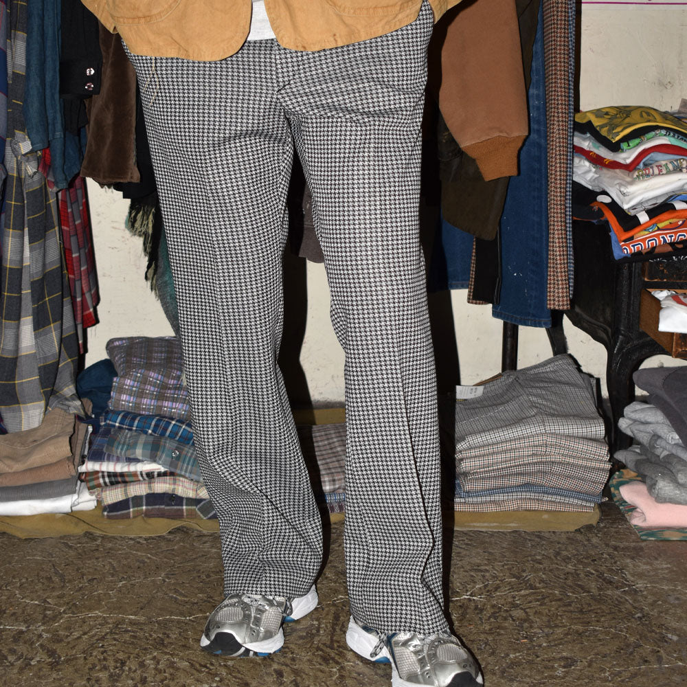 ブラック×ホワイトの千鳥格子にセンタープレスが映える、当時らしい艶やかで端正な一本です。