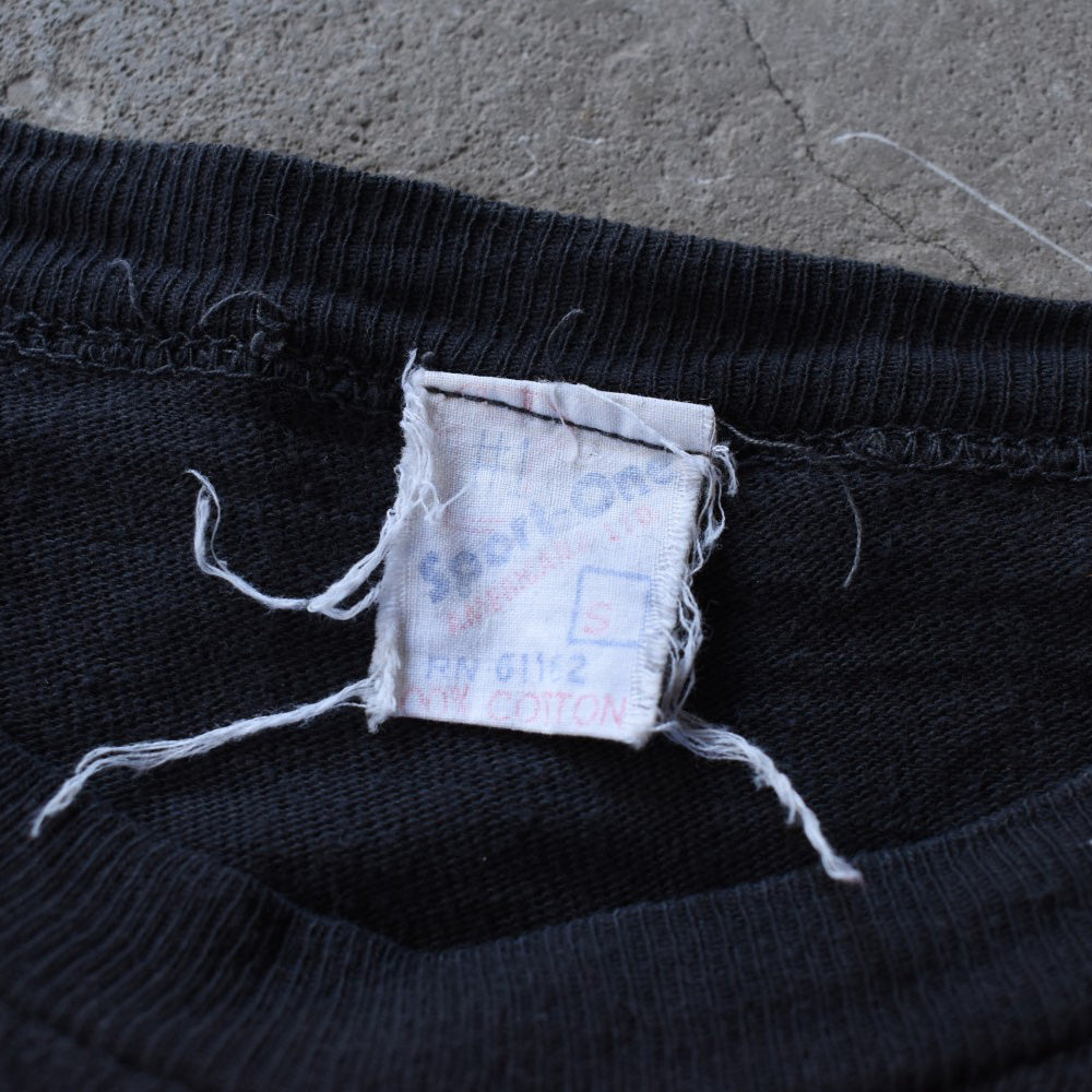 プリントの発色は抑えめですが、そのぶんボディと一体化していて、経年で色が沈んだ黒地に自然に馴染んでいます。割れや剥がれではなく、最初から薄く刷られている感じが、この年代らしい。