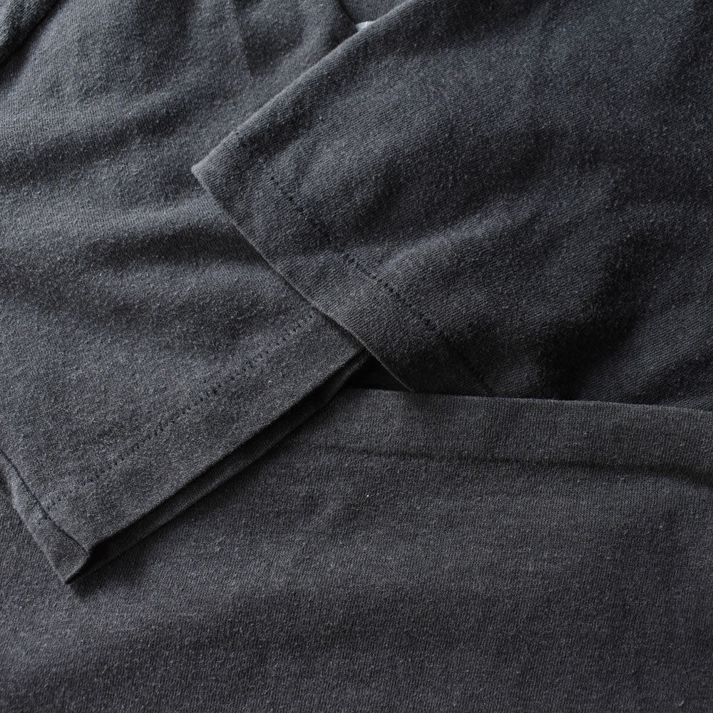 ボディはPLATINUM T’s、USA製のXLサイズ。コットン/ポリエステル混紡のブラックボディに程よいフェードが加わり、プリントのホワイトとイエローがヴィンテージらしい奥行きを見せています。袖裾はシングルステッチ仕様。