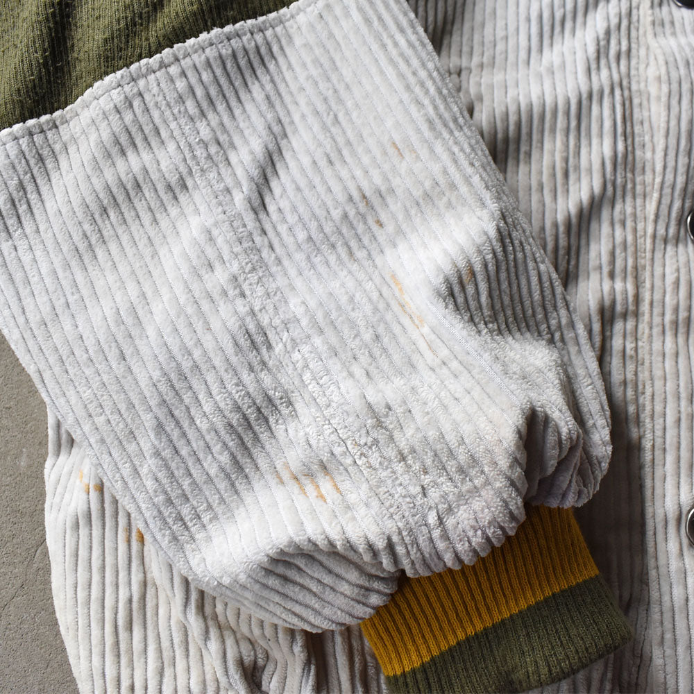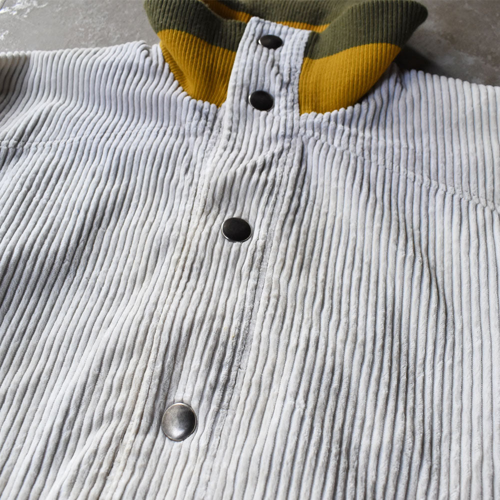 アイボリーの太畝コーデュロイをベースに、マスタード×オリーブのリブを配した配色が絶妙。