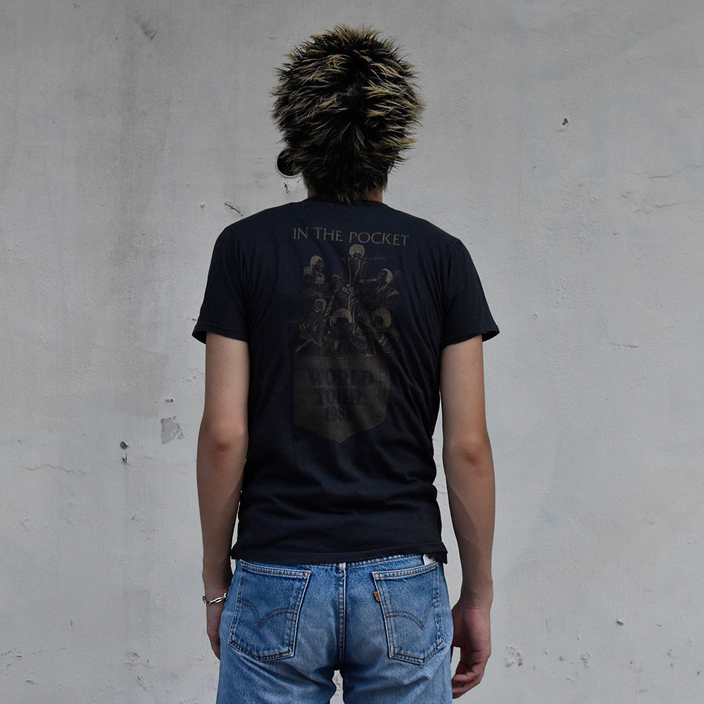 note...USポップ・ファンクバンド、コモドアーズ。81年リリースアルバム“In the Pocket”のワールドツアーTシャツ。フロントにメンバーのプリント。バックにはジャケットでも使用されたユニークなポケットデザイン!ブラックボディに映えるゴールドのプリントカラーが雰囲気抜群。市場でも出回りの少ないヴィンテージ、コモドアーズTシャツです!