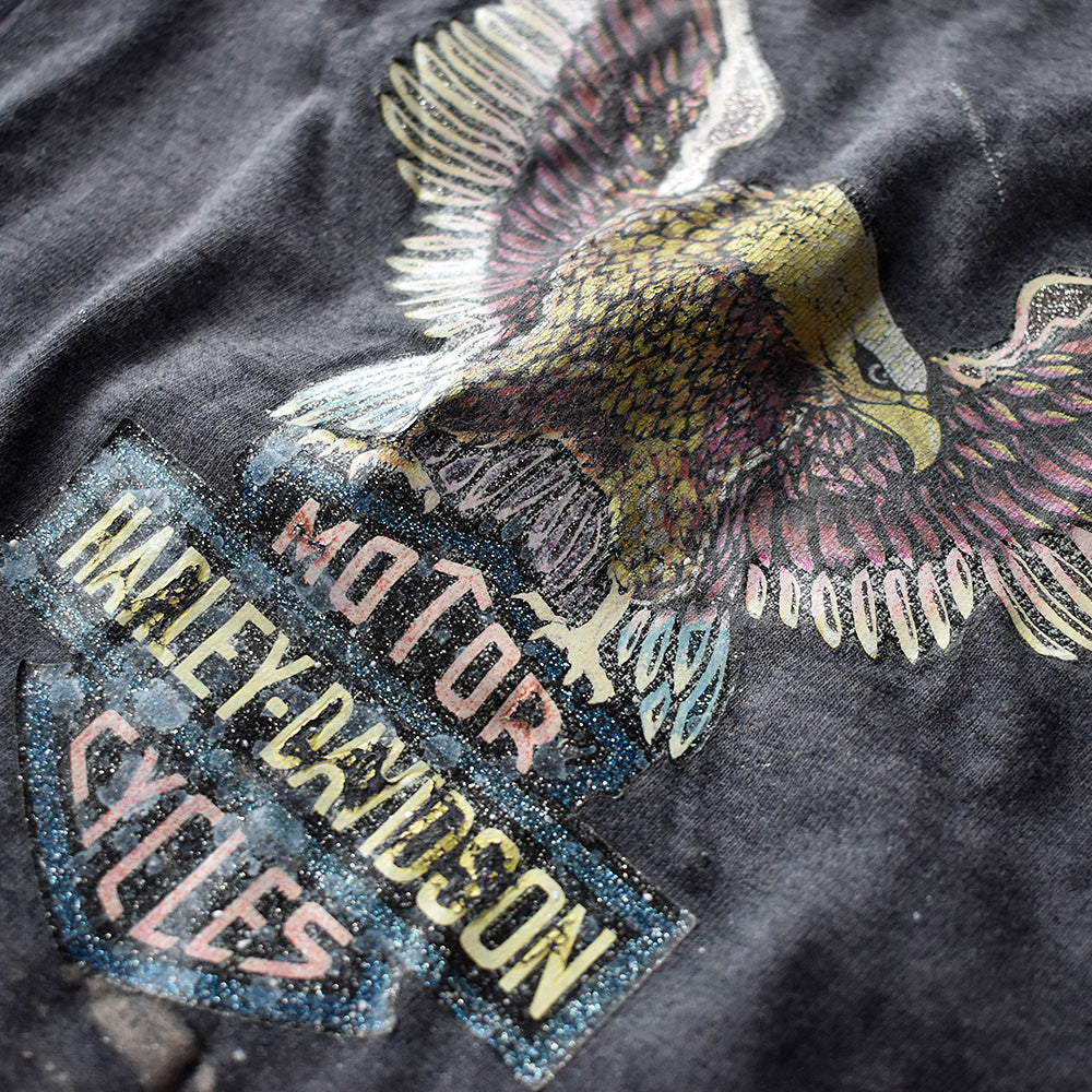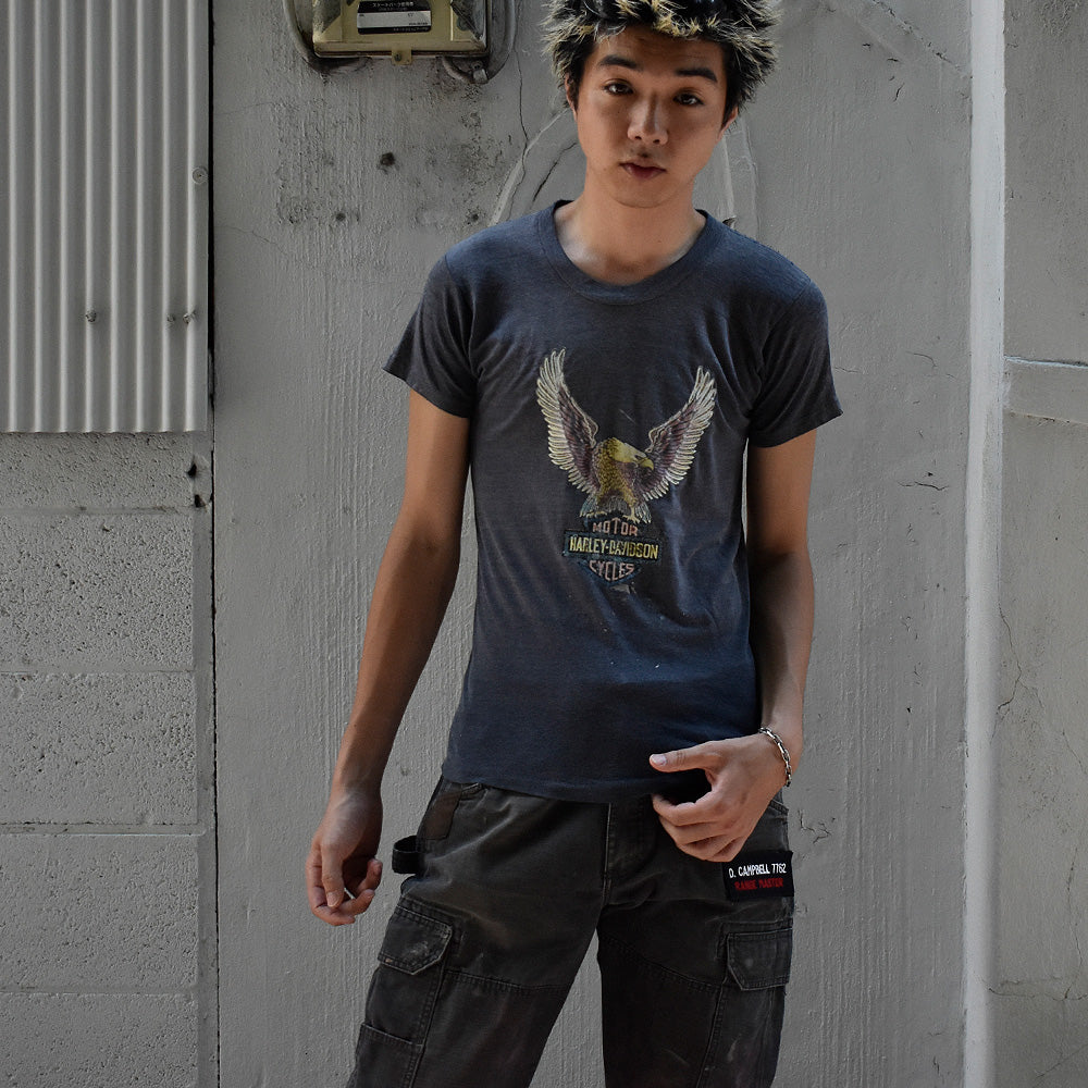 note...アメリカンバイカーの象徴、Harley-DavidsonヴィンテージTシャツ。フロントに人気のハーレーロゴ×イーグルのミックスグラフィック!味のあるフェードボディとヴィンテージ特有のアイロンプリントが雰囲気抜群。素材はコットン、ポリエステル。国内外のファンから高い支持を集める、ヴィンテージハーレーTシャツです。