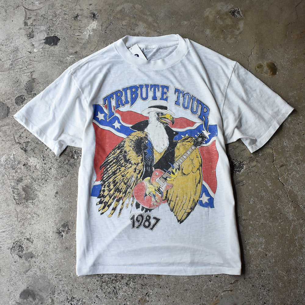 note...USサザン・ロックバンド、レーナード・スキナード。77年の飛行機墜落事故で亡くなったオリジナル・バンドメンバーを追悼するために行われた、87年“Tribute”ツアーTシャツ。フロントにイーグルギター、バックには初期メンバーの名前がプリントされた1枚。87年コピーライト入り。袖、裾シングルステッチ。希少なヴィンテージ、レーナード・スキナードTシャツです。