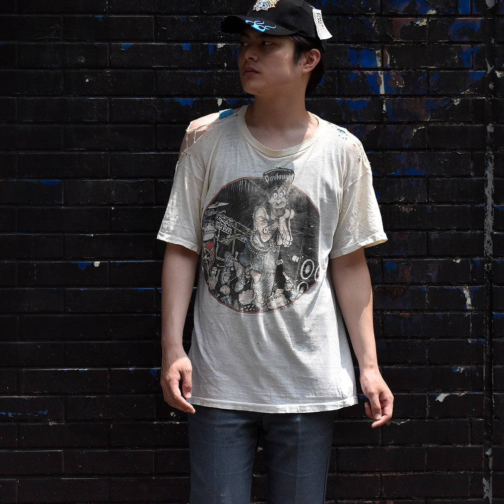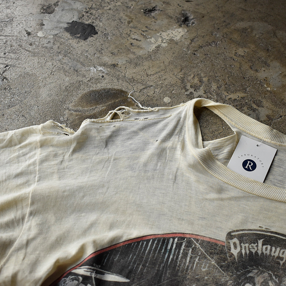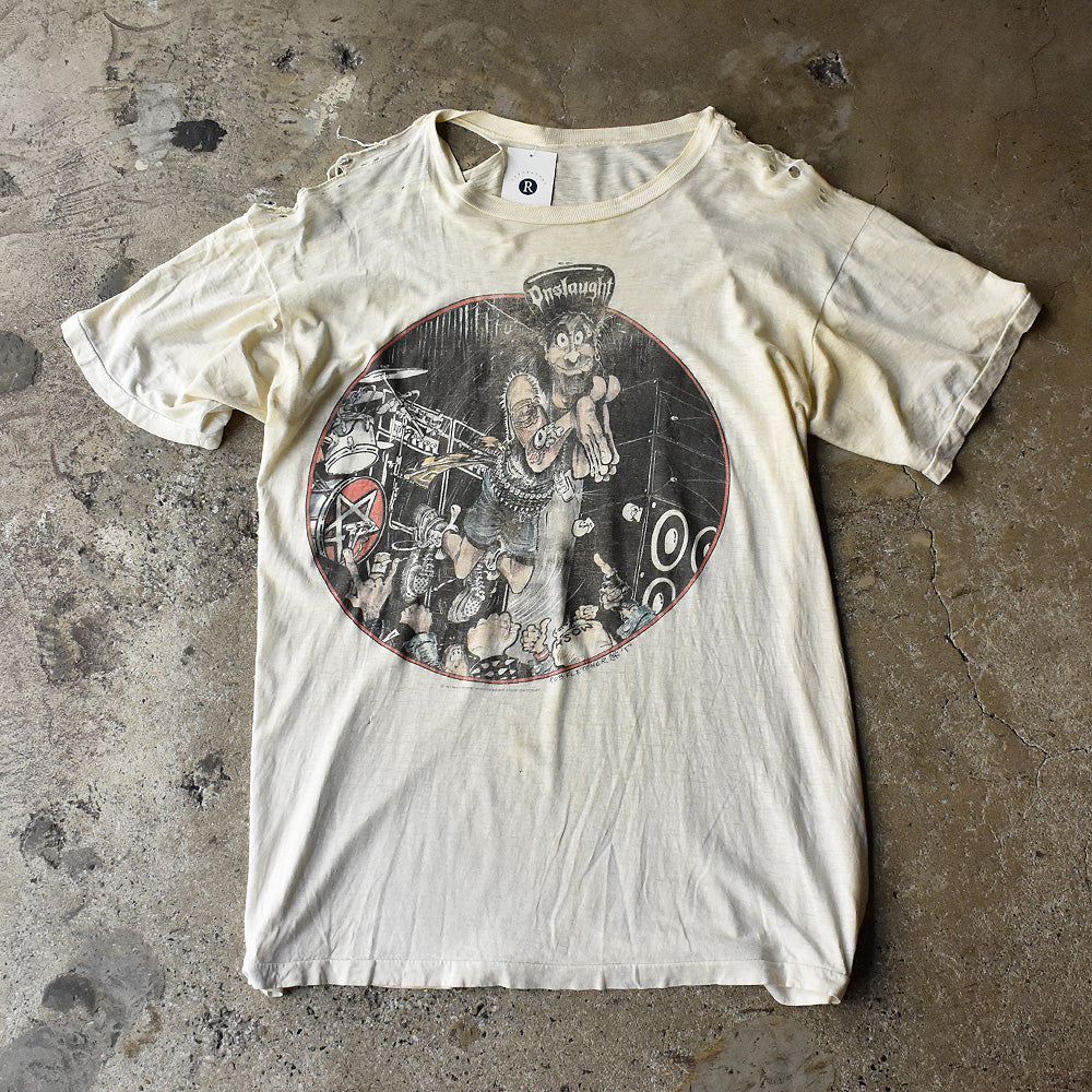 note...UKスラッシュメタルバンド Onslaught。アグレッシブな世界観とユーモアたっぷりのグラフィック、Onslaught Tシャツ。アートワークを手掛けたのは、カルト的人気を誇るイラストレーターRob Fletcher。フロントにライブステージを描いた、インパクト抜群のデザイン。バックにはクリームカラーで“dive!“のロゴがプリントされています。また、ボディ全体に激しいダメージはありますが、これもスラッシュメタルらしいハードコアな雰囲気!87年コピーライト入り。袖、裾シングルステッチ。市場でも滅多に出回る事のないヴィンテージ、Onslaught Tシャツ。コレクターピースの1枚です。