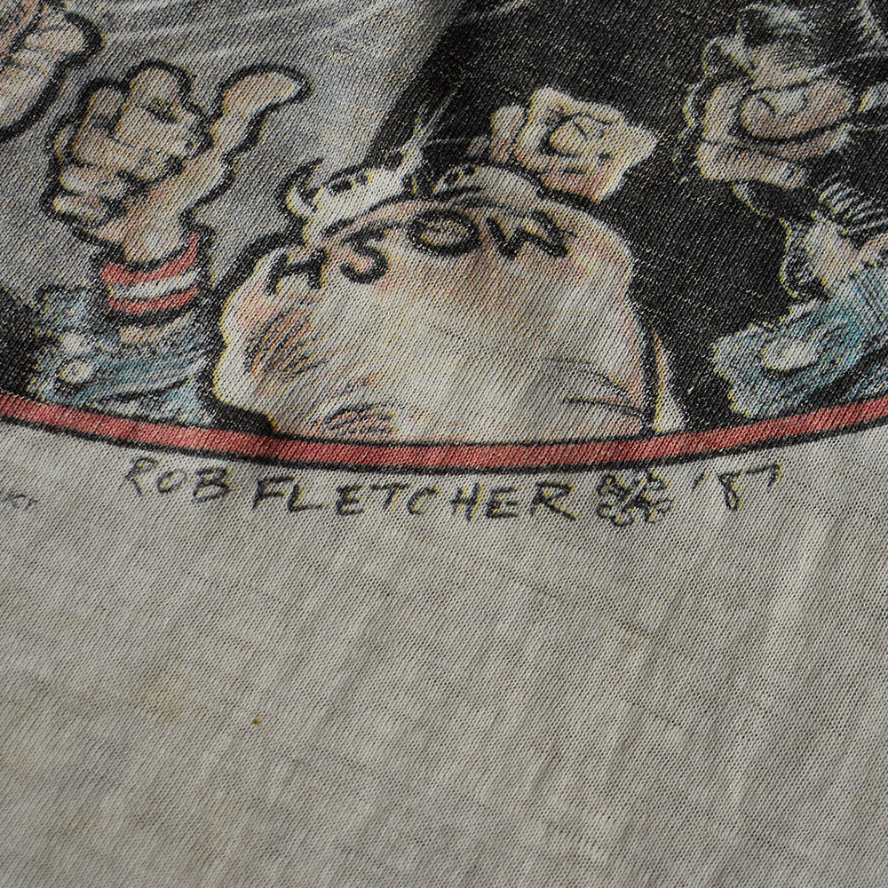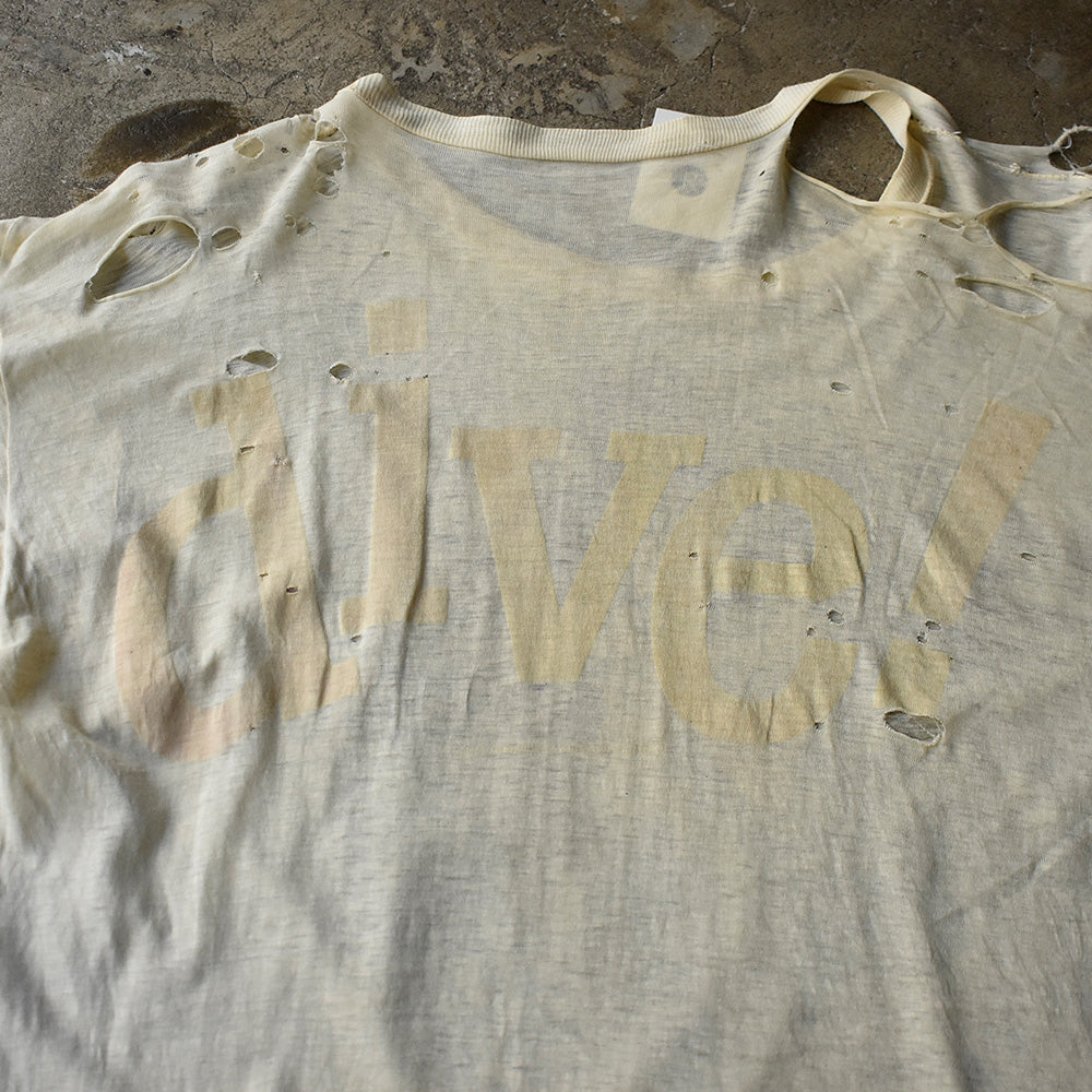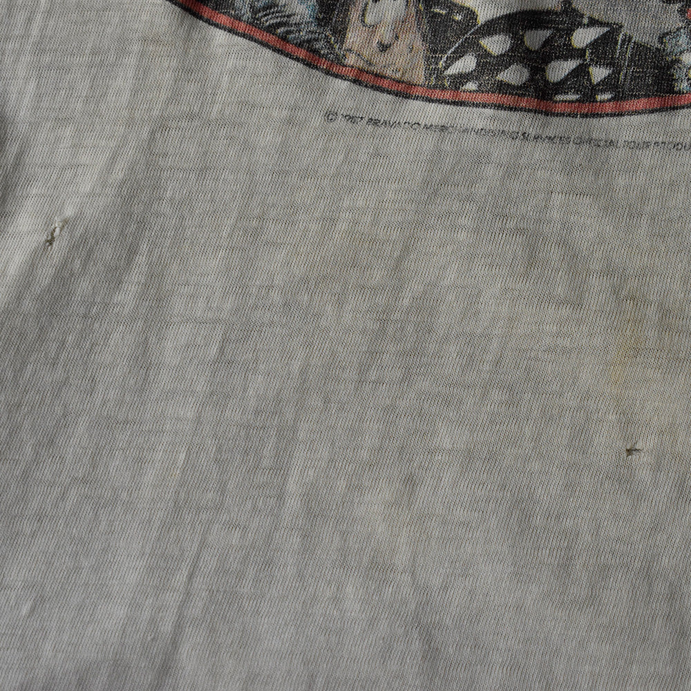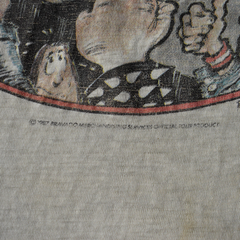 note...UKスラッシュメタルバンド Onslaught。アグレッシブな世界観とユーモアたっぷりのグラフィック、Onslaught Tシャツ。アートワークを手掛けたのは、カルト的人気を誇るイラストレーターRob Fletcher。フロントにライブステージを描いた、インパクト抜群のデザイン。バックにはクリームカラーで“dive!“のロゴがプリントされています。また、ボディ全体に激しいダメージはありますが、これもスラッシュメタルらしいハードコアな雰囲気!87年コピーライト入り。袖、裾シングルステッチ。市場でも滅多に出回る事のないヴィンテージ、Onslaught Tシャツ。コレクターピースの1枚です。