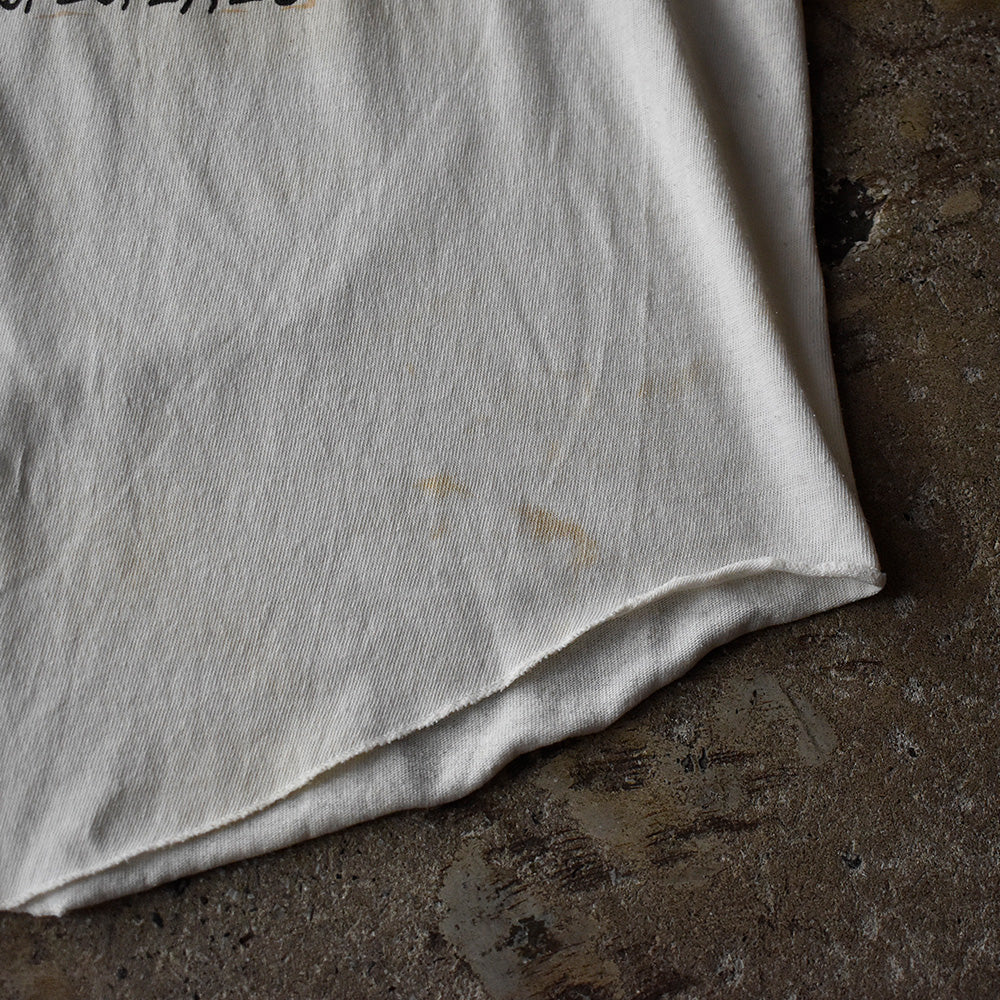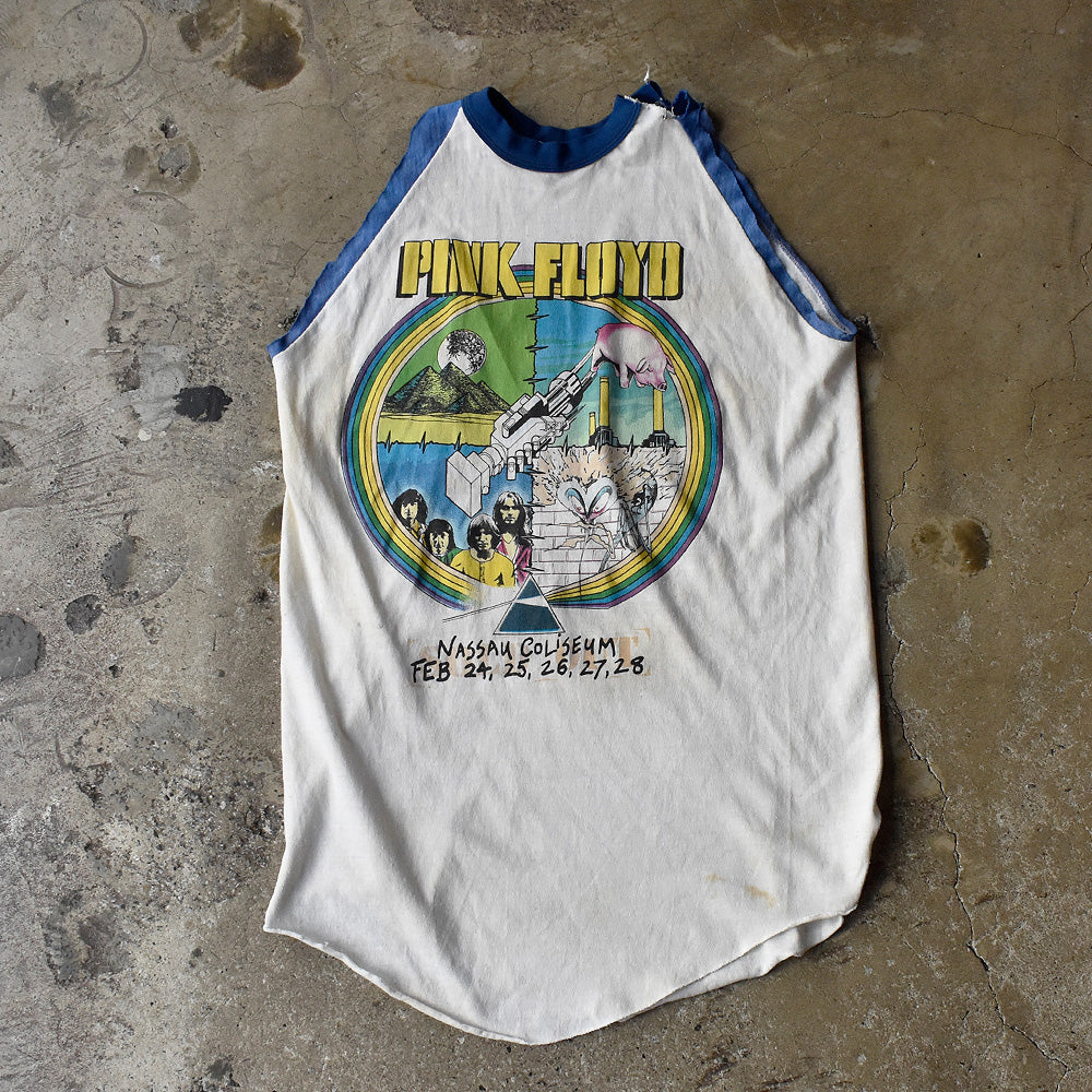 note...プログレッシブロックの巨匠、PINK FLOYD。80年代に行われた“NASSAU COLISEUM“ラグランスリーブTシャツ。フロント、バックに入るジャケットアートワークプリント。両袖はカットオフ仕様。レイヤードスタイルも楽しめるアイテム。珍しいラグランスリーブのカットオフが、ヴィンテージならではのクールな雰囲気!国内外で人気を誇るピンク・フロイドTシャツです。