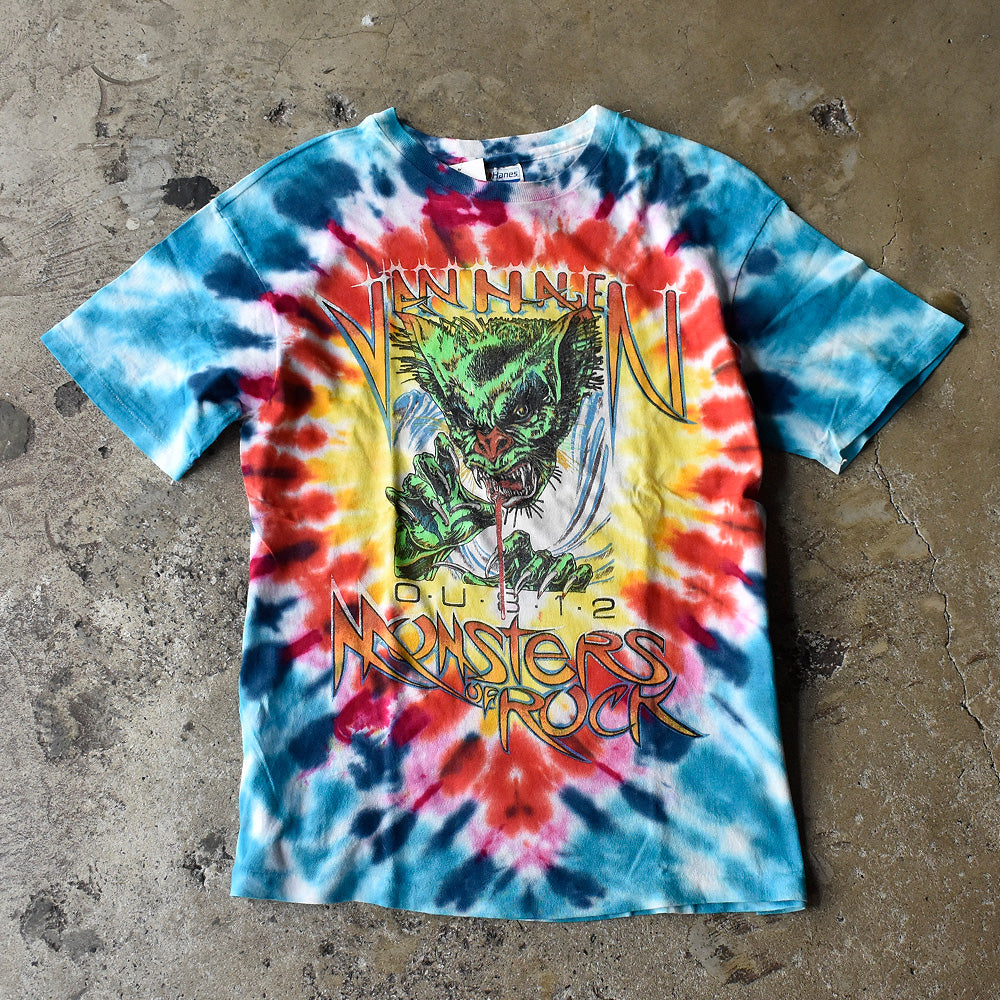 note...USハードロックバンド、ヴァン・ヘイレン。88年に行われた“MONSTERS OF ROCK”ツアーTシャツ。Scorpions、Metallica、Dokken、Kingdom Comeといった人気バンドを従え、Van Halenがヘッドライナーを務めた伝説のロックフェス・ツアーMONSTERS OF ROCK!フロントに迫力のあるグラフィック。バックにはツアー日程がプリントされています。綺麗なタイダイ染めボディも目を引く1枚。タグはヘインズのL表記。USA製。袖、裾シングルステッチ。希少なヴィンテージ、MONSTERS OF ROCK Tシャツです。