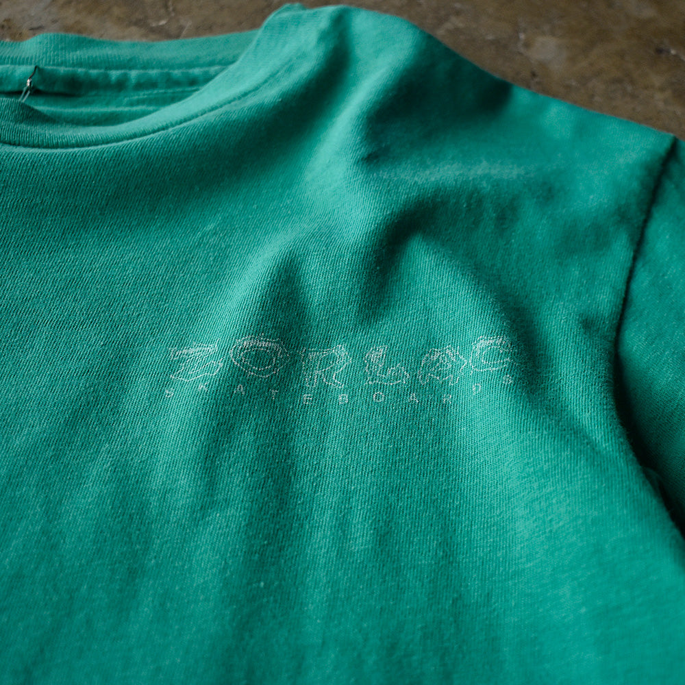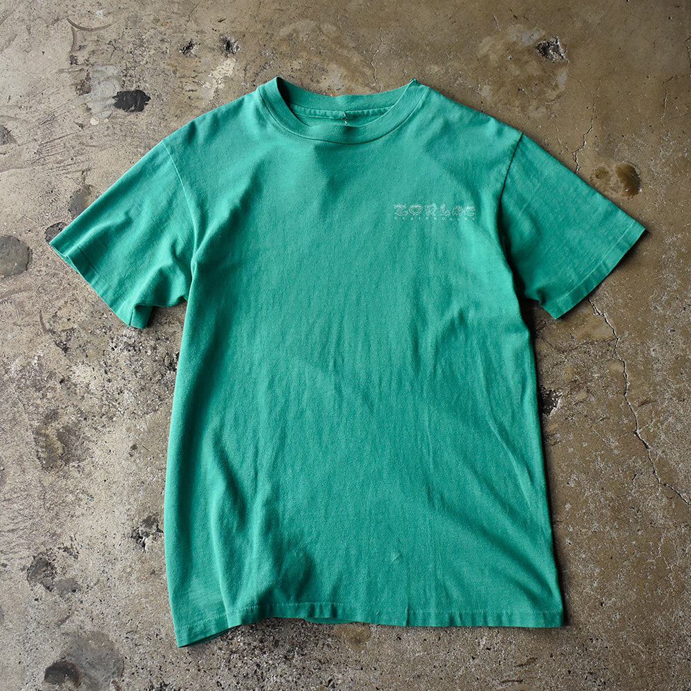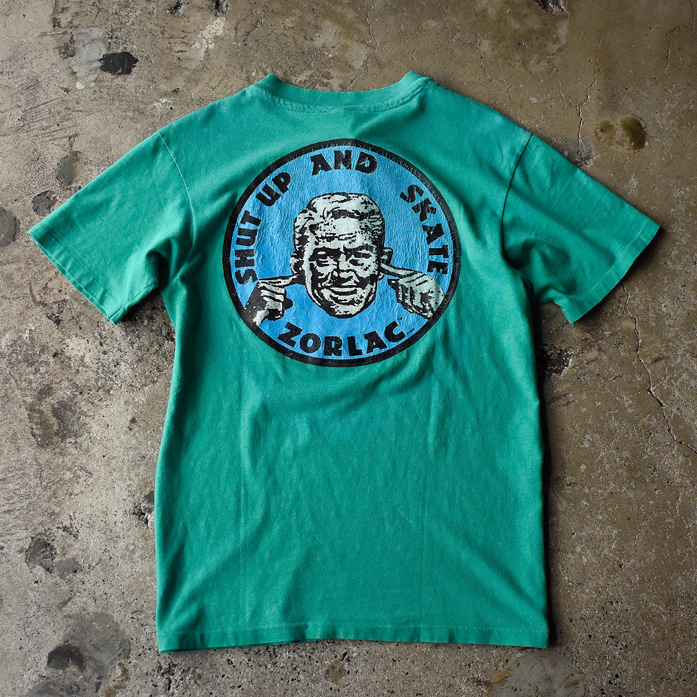 note...アメリカ・カリフォルニアの伝説的スケートボードブランド、Zorlac Skateboards。ブランドの代表作ともいえる“Shut Up and Skate“グラフィックTシャツ。グリーンボディにスカイブルーのプリントカラー。胸元にはZorlacロゴ。85年コピーライト入り。袖、裾シングルステッチ。希少価値も高く、市場に出回ることのないヴィンテージ、Shut Up and Skate Tシャツ。コレクターズピースのスペシャルな1枚です。