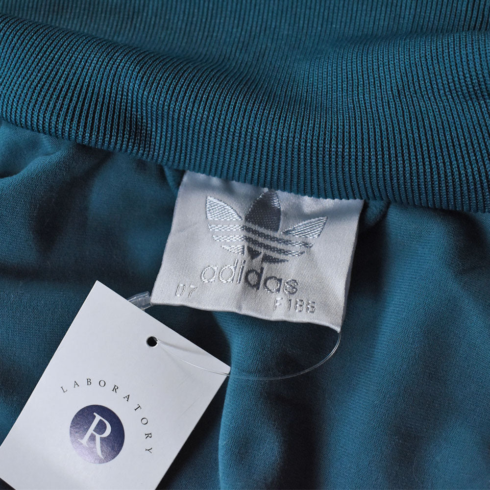 深いティールにネイビーの切り替え、胸には同色の“adidas”ロゴ刺繍。
