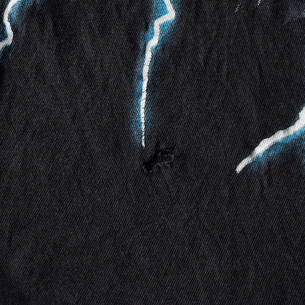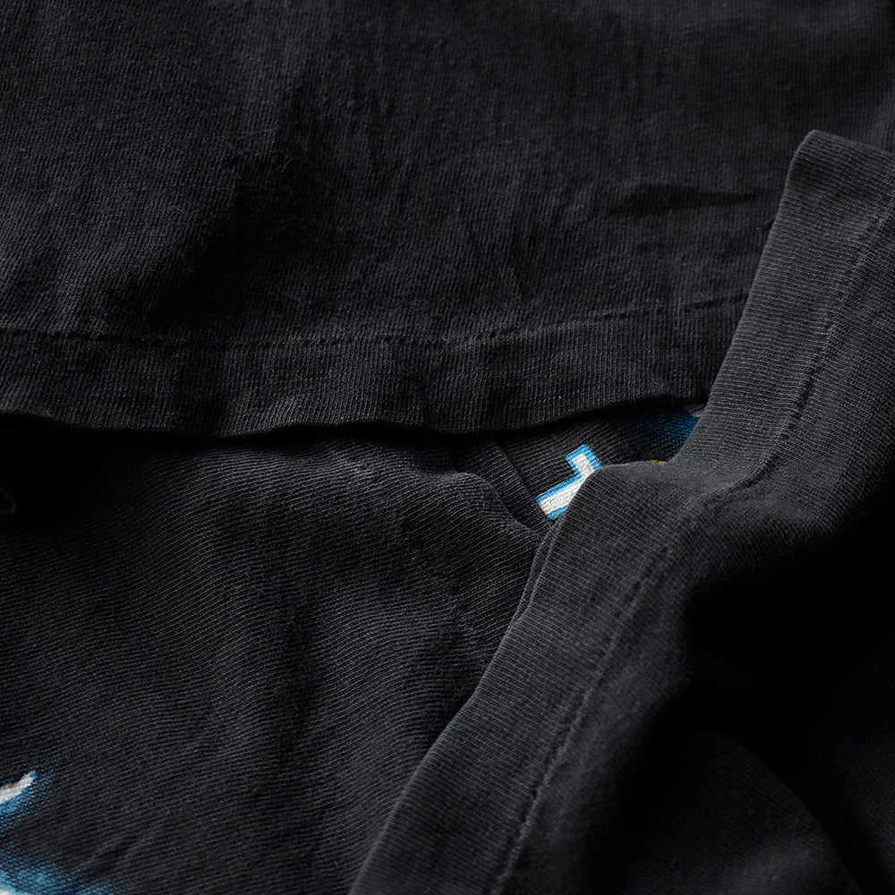 note...フロント、バックに入る迫力のあるサンダープリント、AMERICAN THUNDERウルフグラフィックTシャツ!立体感あるブルーホワイトのプリントカラーも美しい一枚。実寸サイズはワイドシルエットのXL位。袖、裾シングルステッチ。海外でもコレクターが多いAMERICAN THUNDER。年々価格も高騰してきました。お早めにどうぞ。
