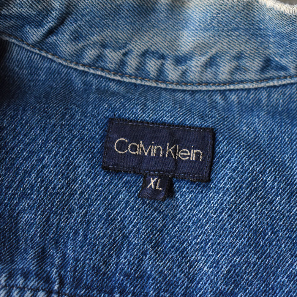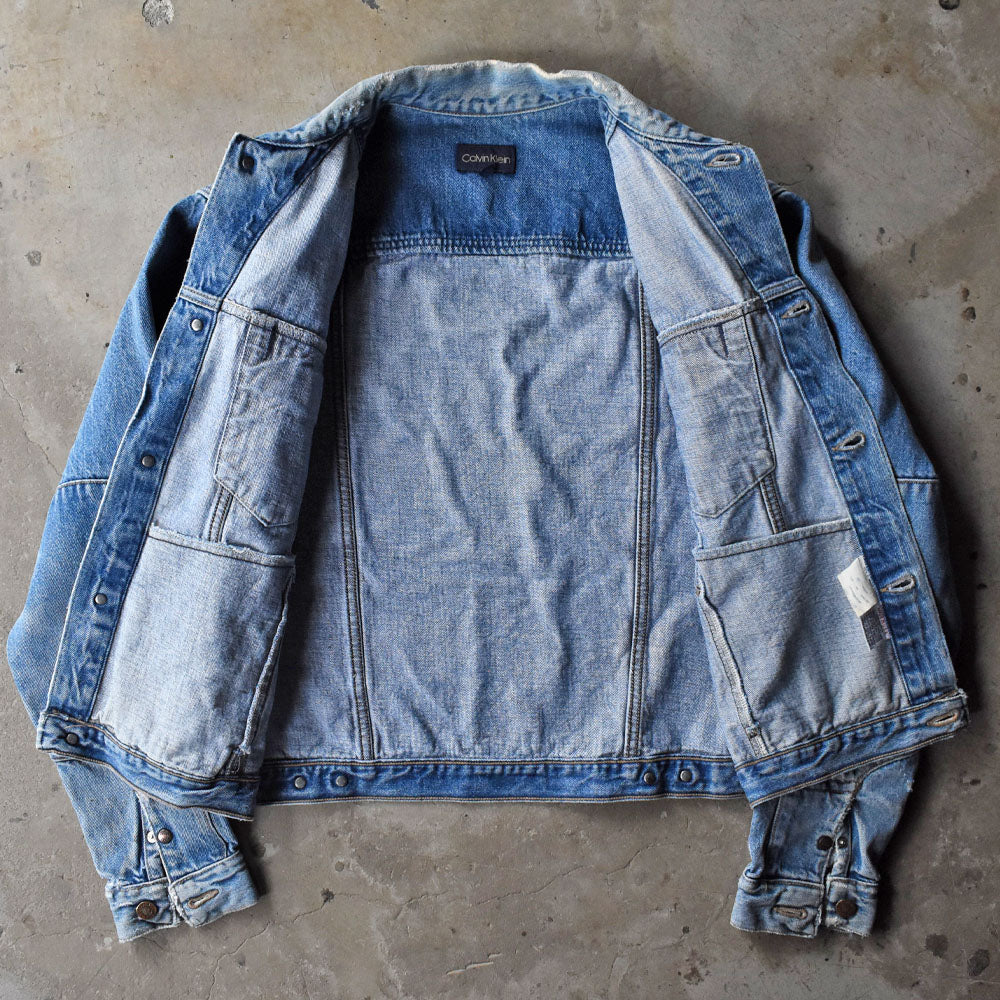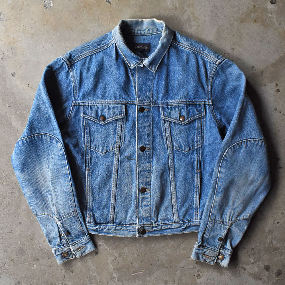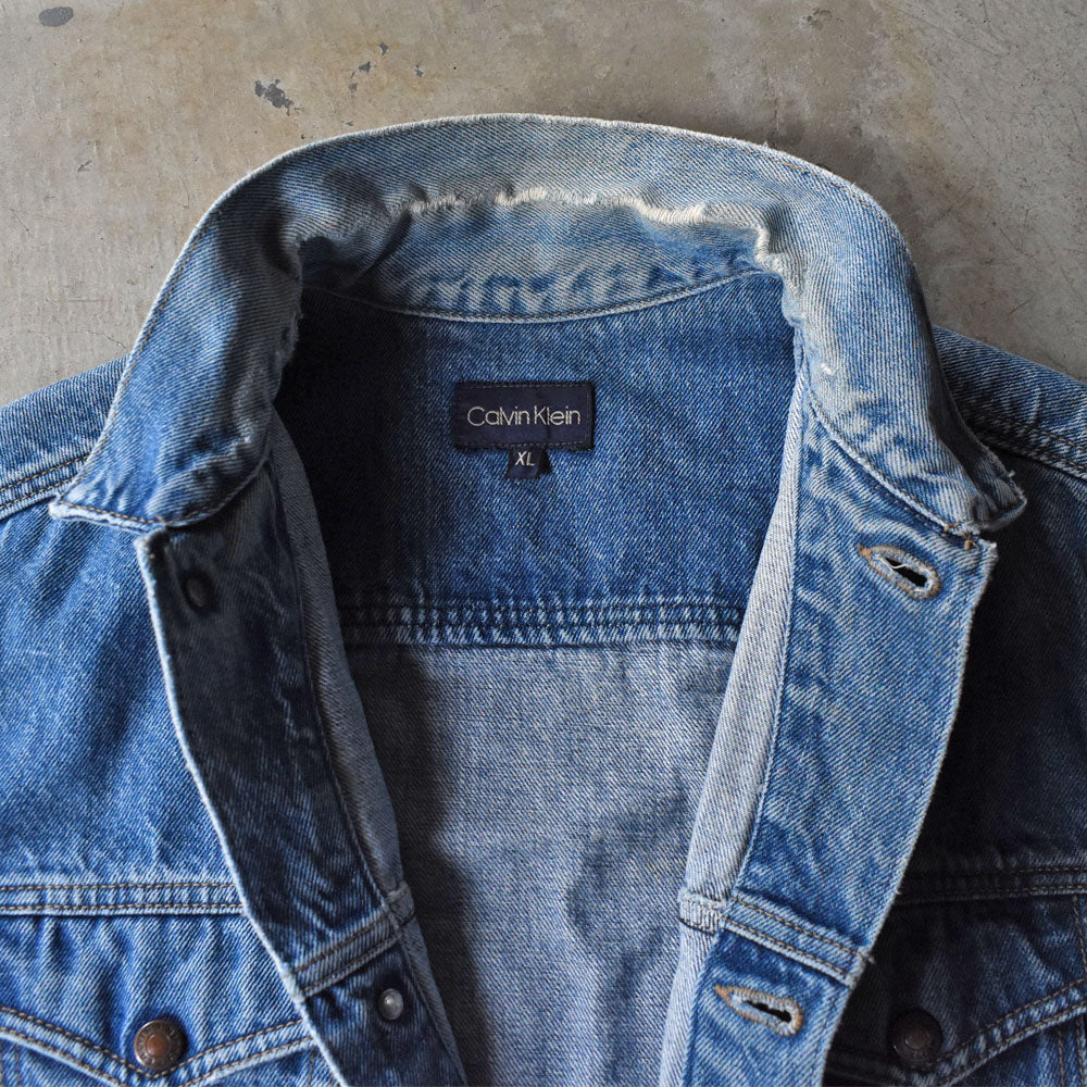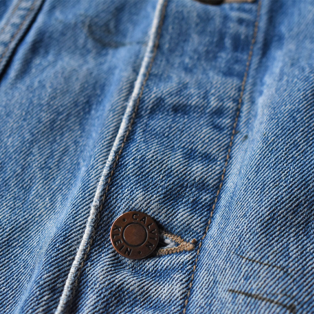 note...カルバン・クラインによる、USA製のデニムジャケット。ミニマルな面構えに、縦長ポケットとタイトめな着丈。無骨なワークウェアとは異なる、都会的でクリーンな印象が際立つ一着です。 スリーブは独特の切り替えラインが入り、腕まわりの立体感と自然な可動性を両立したブランドらしいモード感のあるディテール。 フェードやアタリも美しく、100%コットンデニム特有の表情がしっかりと育っている個体。90年代らしいバランス感が今の空気にもフィットする、洗練されたヴィンテージデニムジャケットです。