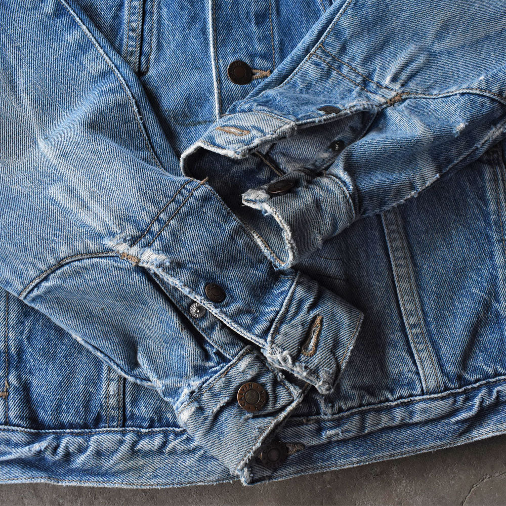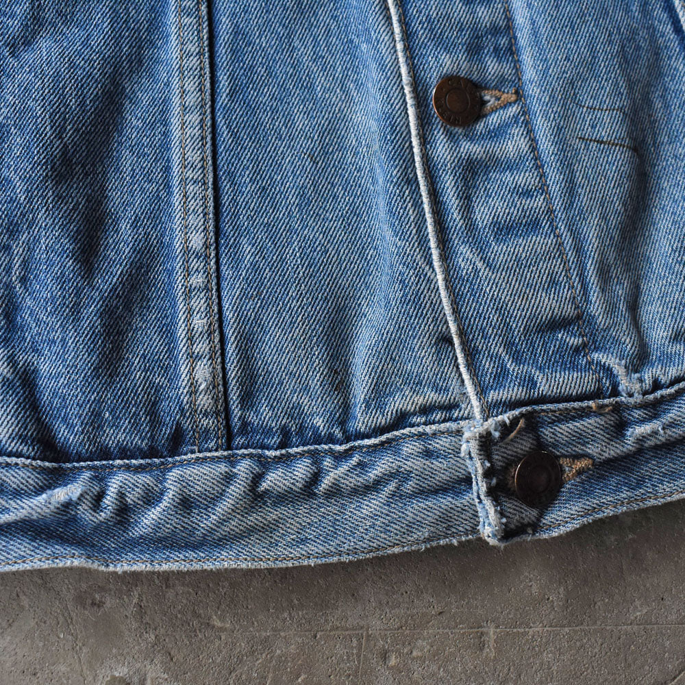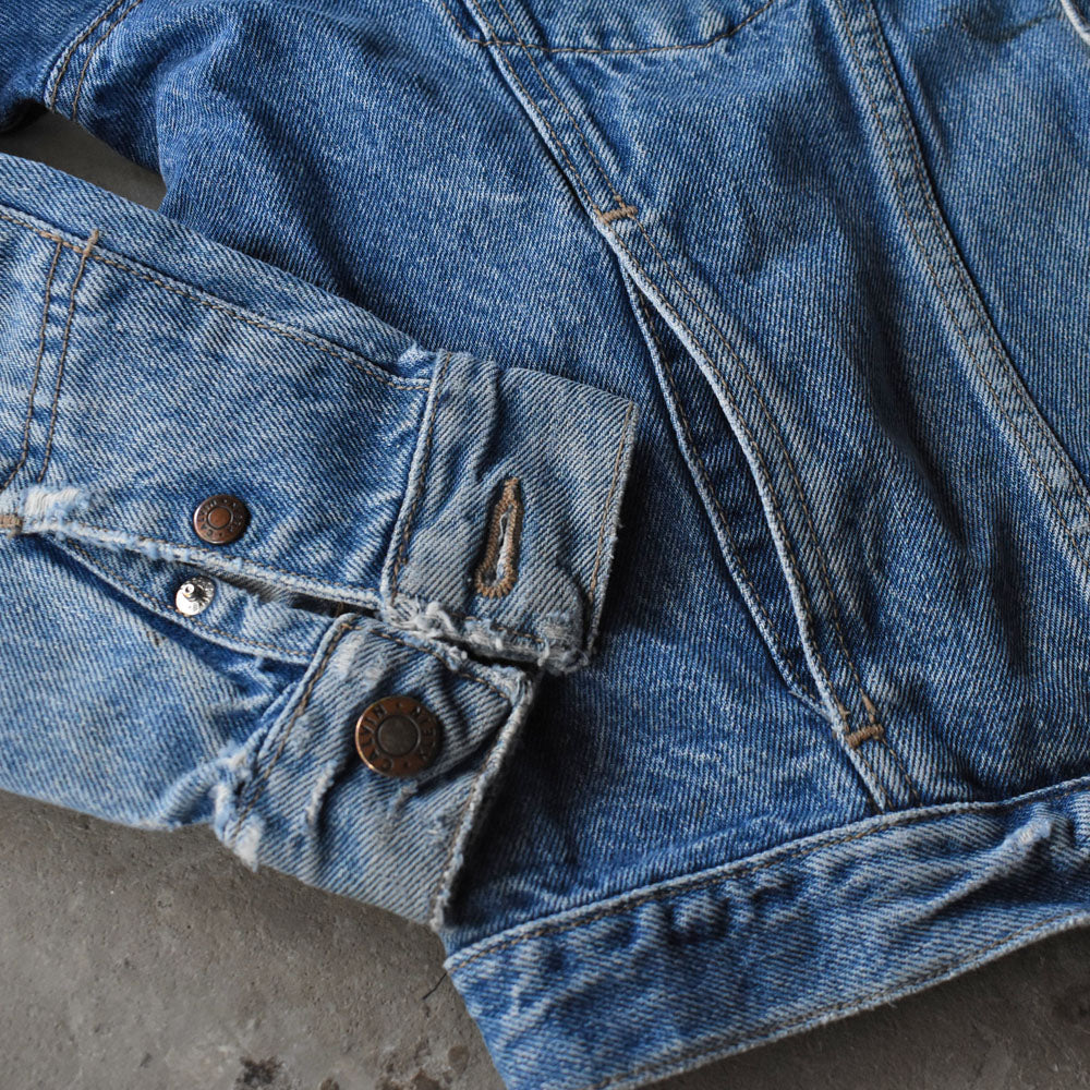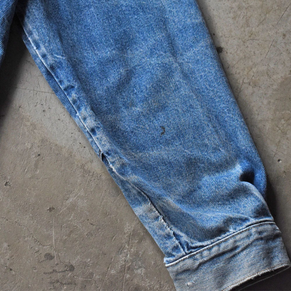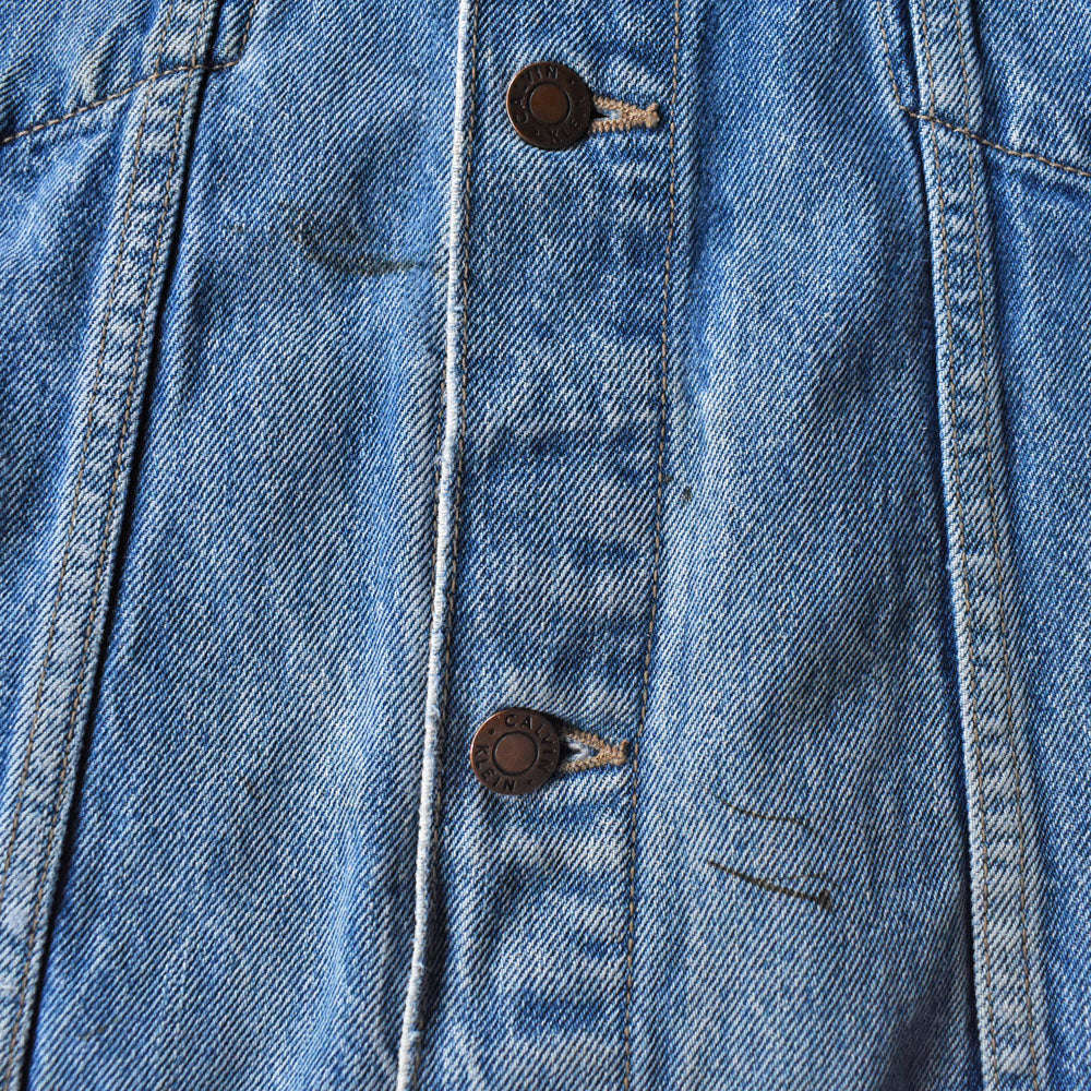 note...カルバン・クラインによる、USA製のデニムジャケット。ミニマルな面構えに、縦長ポケットとタイトめな着丈。無骨なワークウェアとは異なる、都会的でクリーンな印象が際立つ一着です。 スリーブは独特の切り替えラインが入り、腕まわりの立体感と自然な可動性を両立したブランドらしいモード感のあるディテール。 フェードやアタリも美しく、100%コットンデニム特有の表情がしっかりと育っている個体。90年代らしいバランス感が今の空気にもフィットする、洗練されたヴィンテージデニムジャケットです。