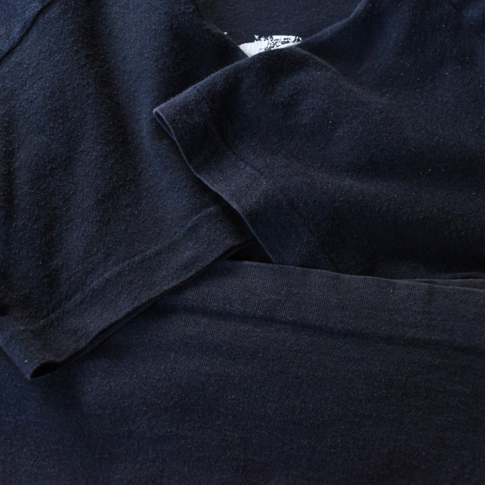 シングルステッチの黒ボディ特有のドライな質感と、フェードした白プリント。