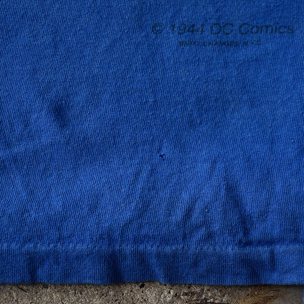 note...DCコミックスを代表する人気ヒーロー、スーパーマン。鮮やかなブルーボディに、胸元いっぱいにプリントされたアイコニックな“S”ロゴが目を引く、まさにアメコミファンにはたまらない1枚。98年DCコミックスコピーライト入り。サイズはXL表記の袖、裾シングルステッチ。USA製です。