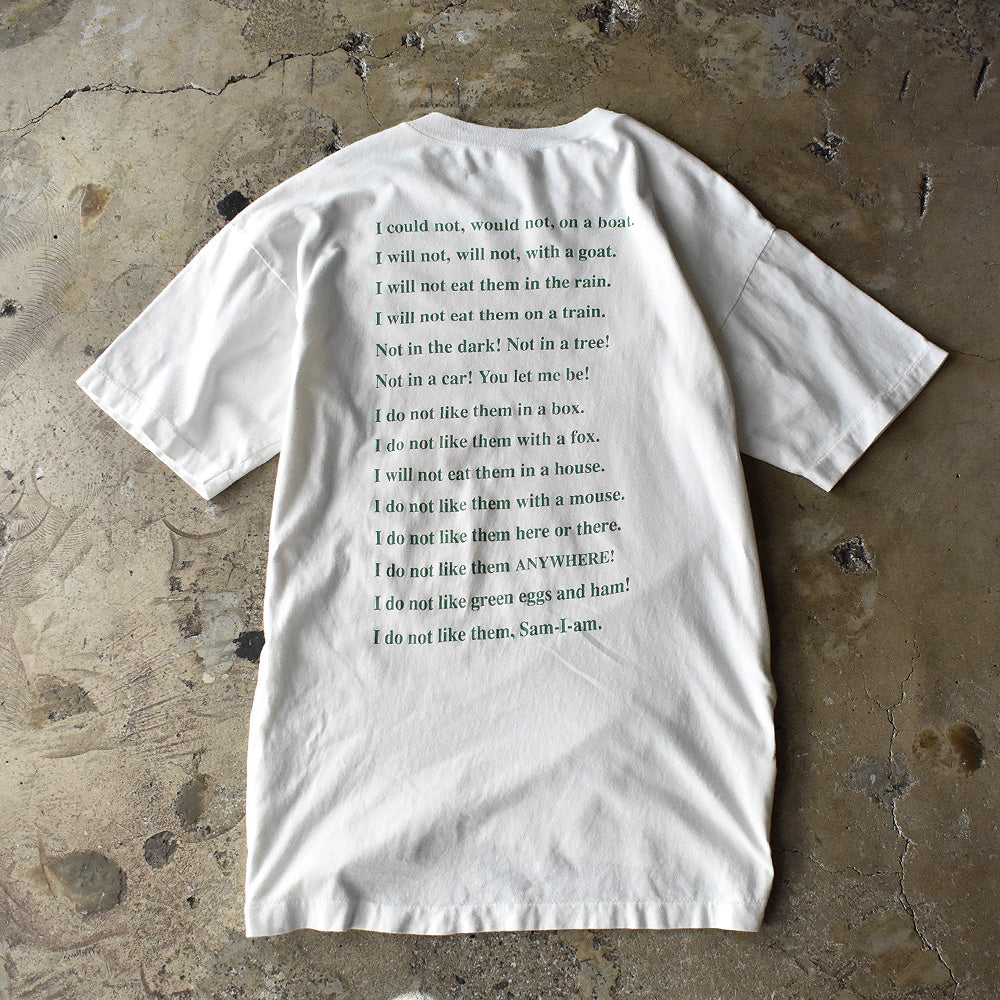 note...アメリカの児童文学の巨匠、Dr. Seussによる名作“The Cat in the Hat“Tシャツ。フロントにはお馴染みのキャラクター、キャット・イン・ザ・ハットがポップにデザインされた1枚。プリントの配置、サイズバランスも完璧。バックにはメッセージ入り。100%コットン素材のカナダ製。袖、裾シングルステッチ。国内外でも人気を誇るヴィンテージ、Dr. Seuss Tシャツです。