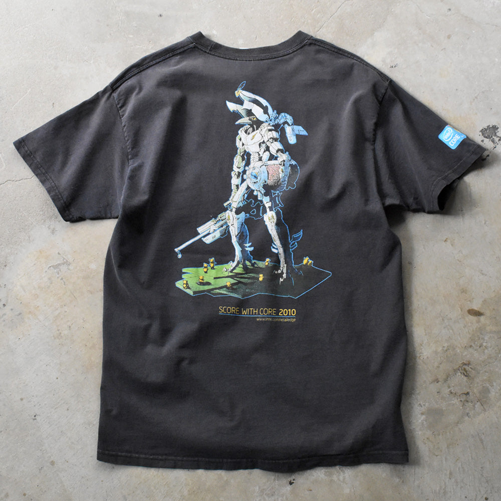 note...センスと存在感が光る、両面プリントのテック系イベントT。フロントには「LATE RISER. EARLY ADOPTER.」のキャッチーな一文、バックにはアニメ調の近未来ロボが立ち構えるド派手グラフィック!袖にはIntelロゴ入り。