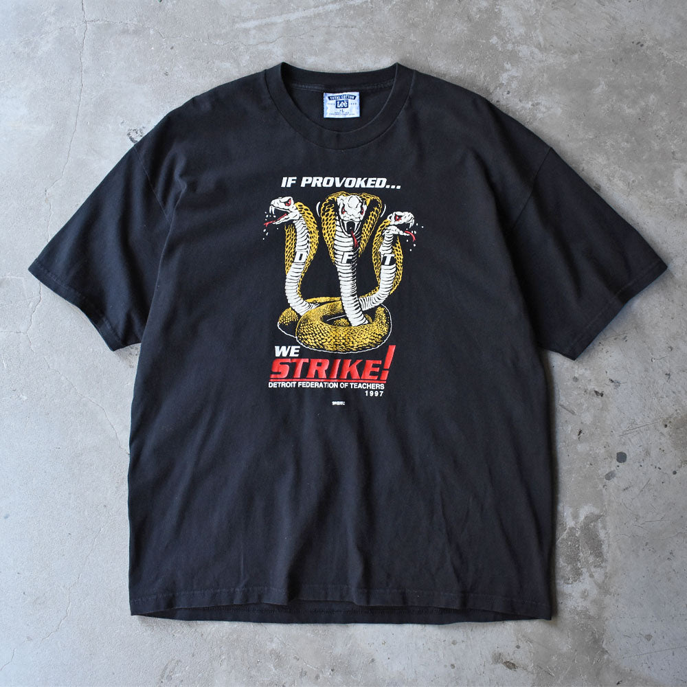 note...3匹のコブラがにらみを利かせる、ただならぬ空気感のグラフィック。1997年にデトロイトの教職員組合がストライキを行った際に制作された、アジテーション色の強い1枚です。 ボディはリーのTOTAL COTTONシリーズ。ドライな質感で、厚すぎず薄すぎず、今着るのにちょうどいいタフさ。嬉しいUSA製です。 グラフィックと背景の強さを、ストリートに自然と落とし込める1着です。