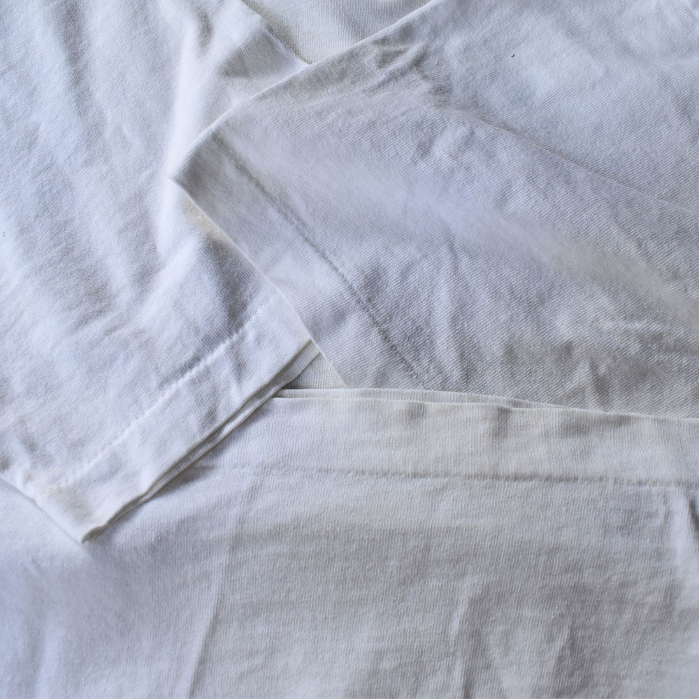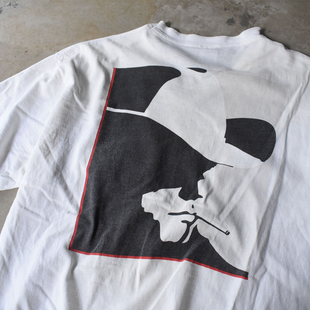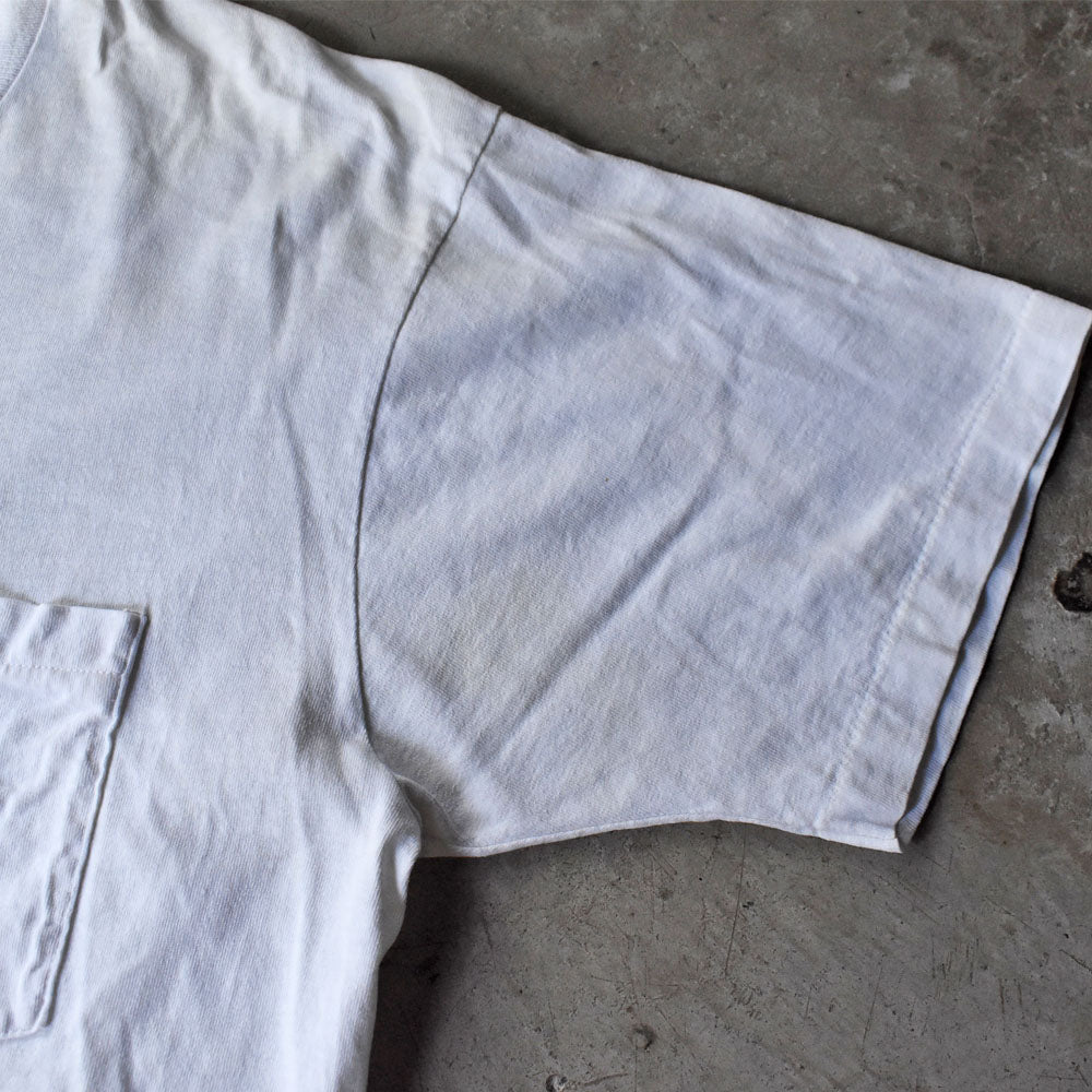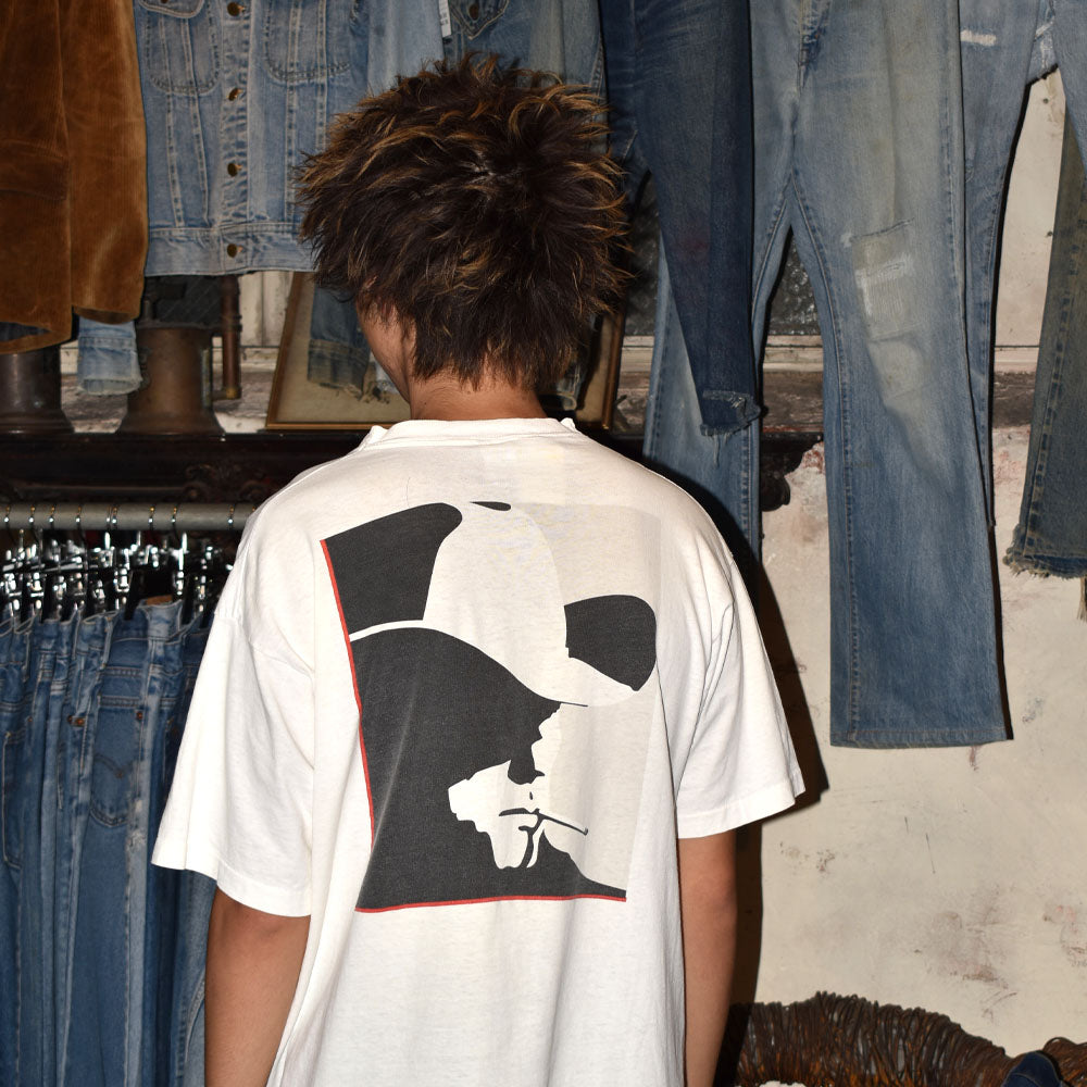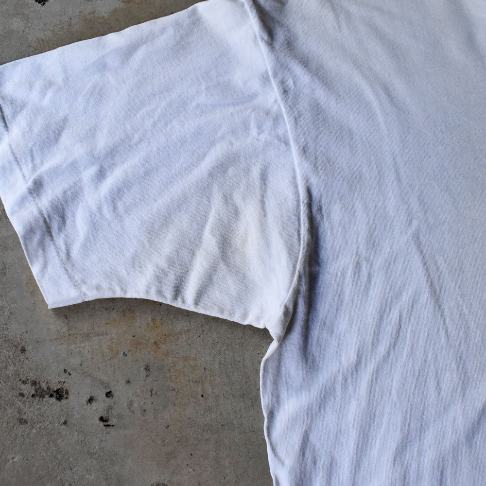 ボディはFruit of the Loom製、Made in USA。胸ポケット付きの実用的な仕様に、背中一面を覆う大判プリント。加えてボディには経年によるシミやわずかな黄ばみがあり、真っ白なキャンバスに時間が刻んだ影のように浮かび上がっています。整った新品にはない、ヴィンテージならではの“リアルな空気”をまとった一枚です。