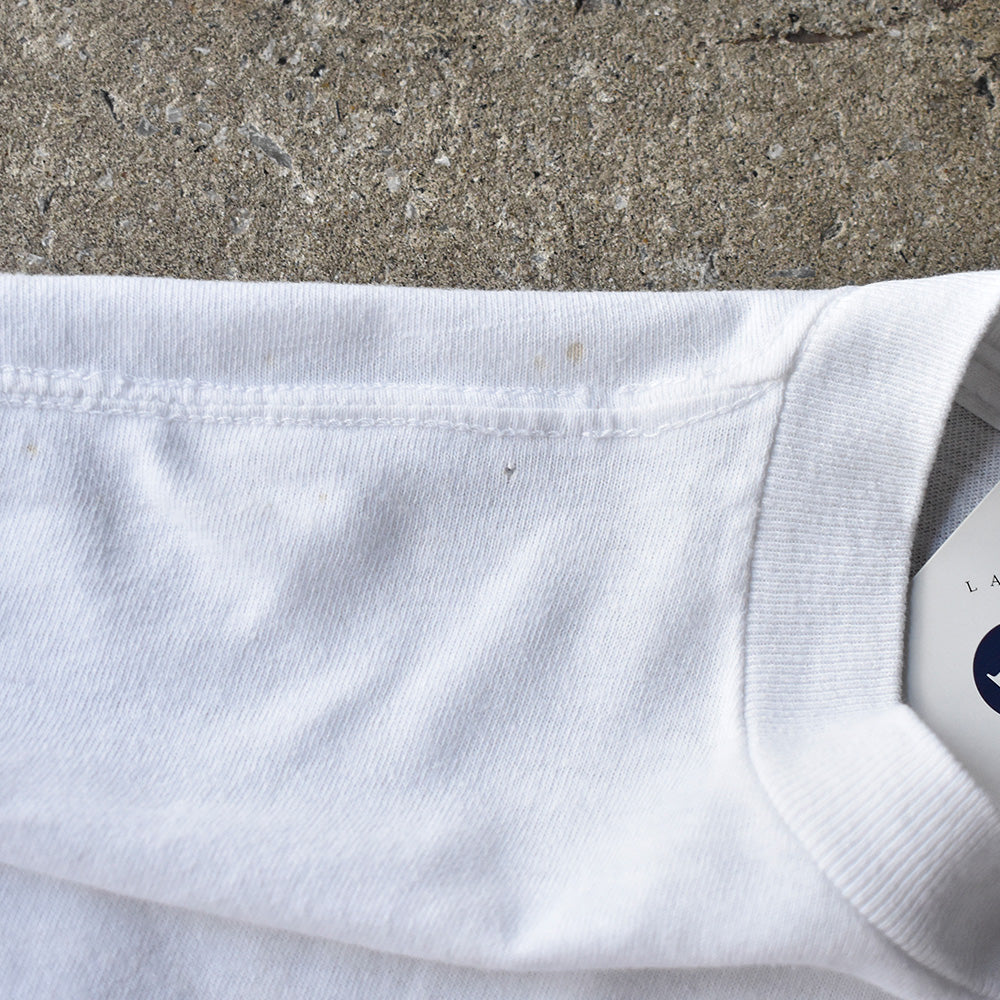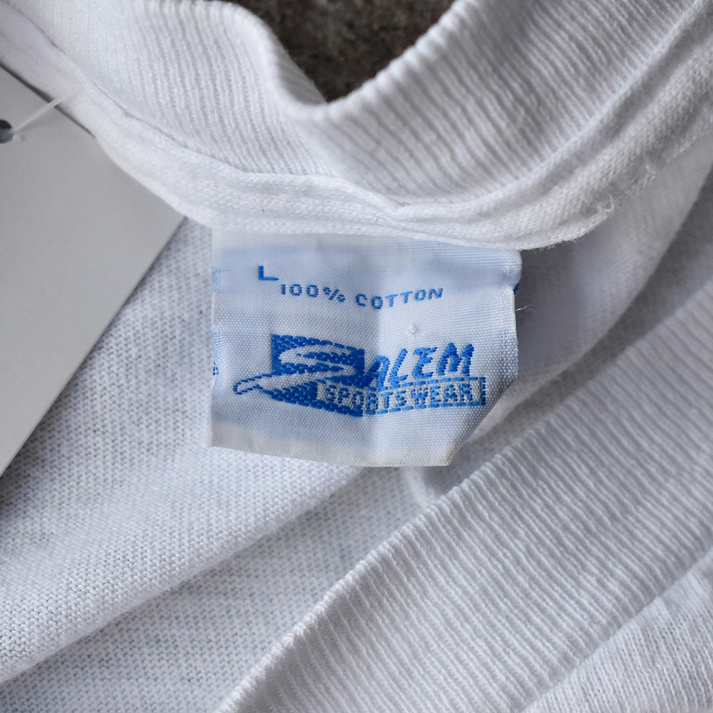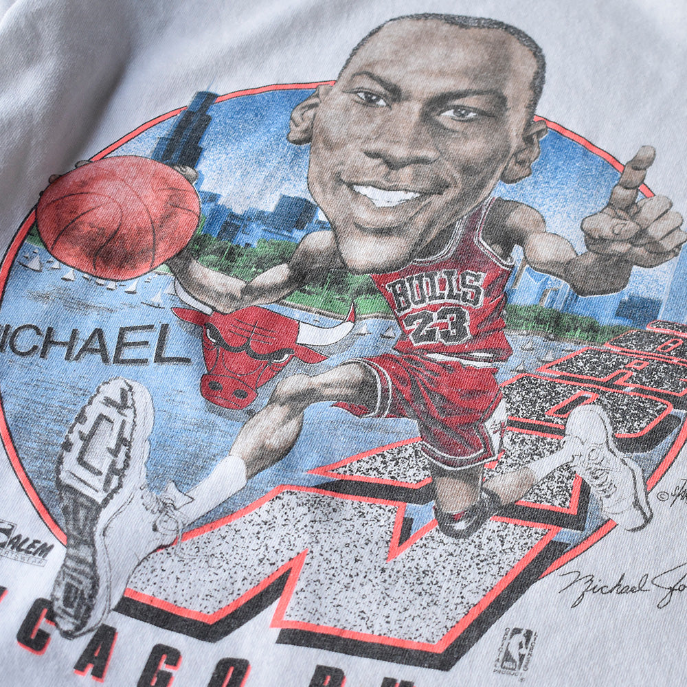 note...NBA界のレジェンド、スーパースター、世界的人気を誇るマイケル・ジョーダン。ユニークで疾走感溢れるジョーダンのイラストTシャツ。ブルズロゴ、サイン、NBAオフィシャルロゴなど多数のプリントも入る豪華なデザイン。サイズはL表記の袖、裾シングルステッチ。年々玉数も減少してきた90's ジョーダンTシャツです。