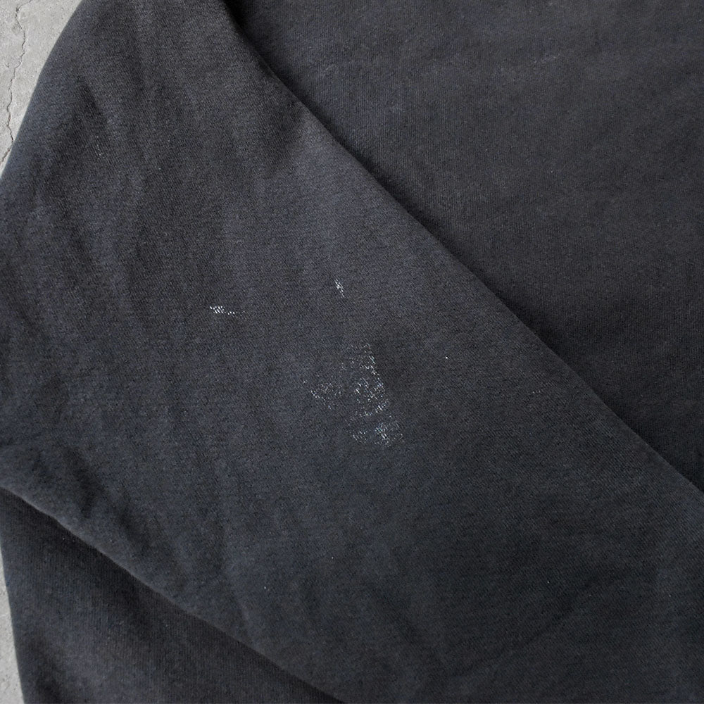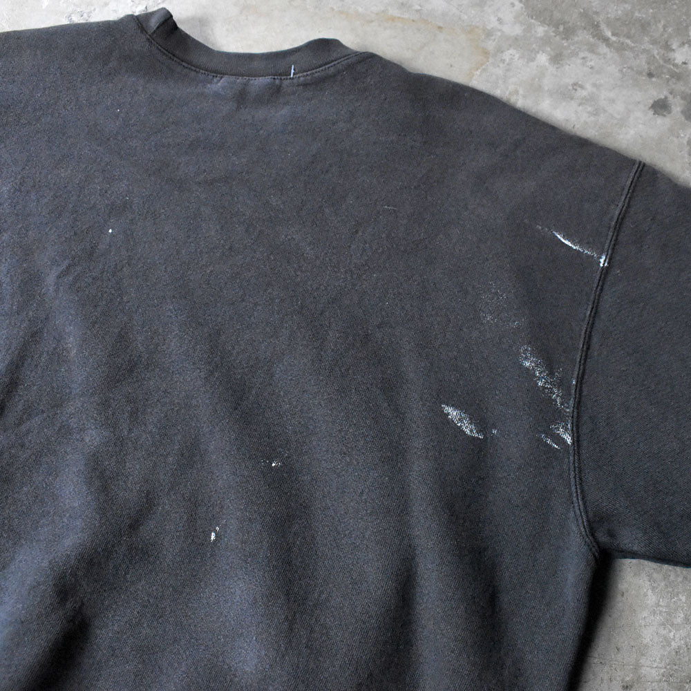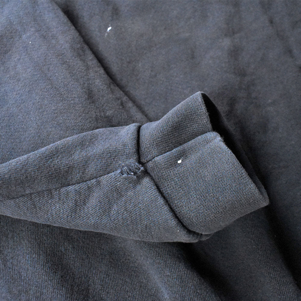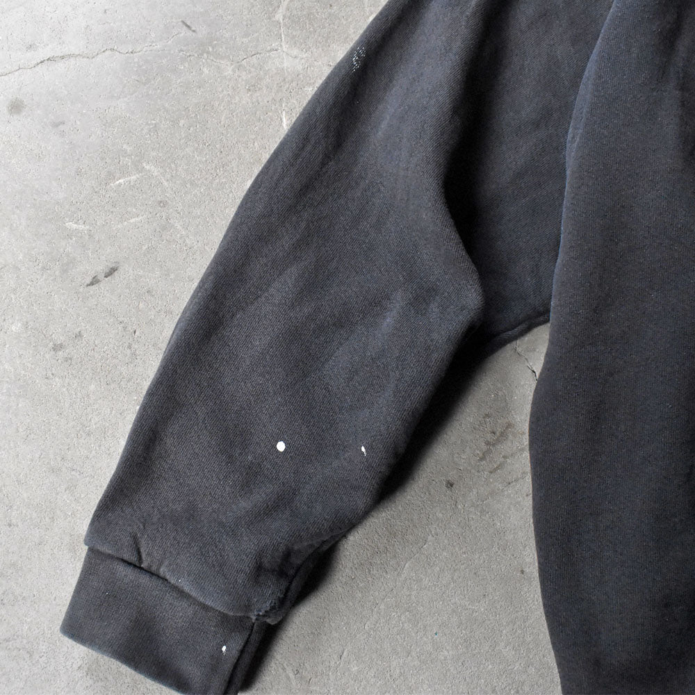 フロントに配された小ぶりなスウッシュ刺繍が、ミニマルでありながら確かな存在感を放つデザイン。黒のボディは長年の着用を経て程よくフェードし、全体に散ったペンキ汚れや細かなスレが、まるでアトリエウェアのような味わいを生み出しています。