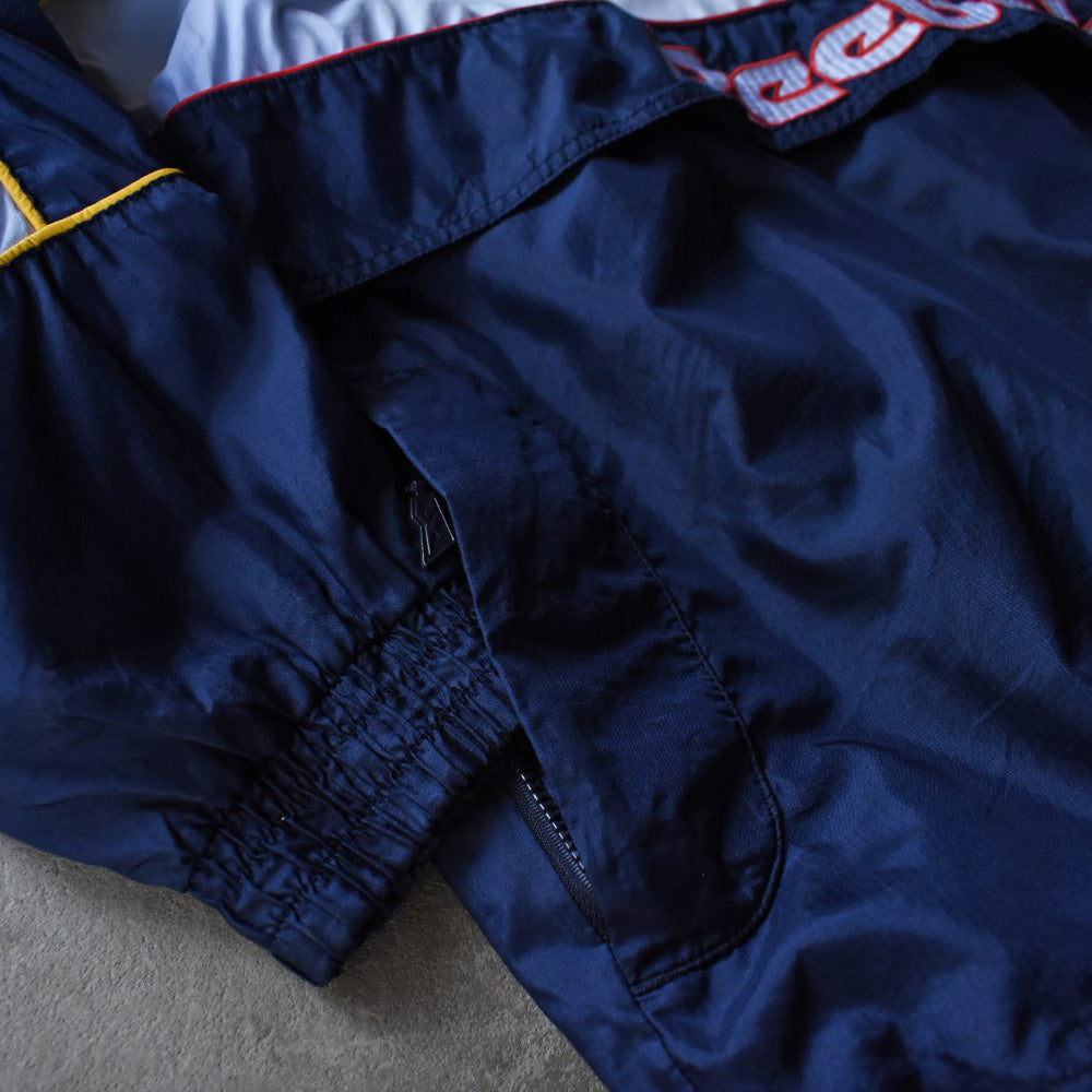 ネイビーをベースに、グレー、イエロー、赤のライン。配色ははっきりしているのに、どこか品がある。アメリカのトレーニングウェアがベースなのに、空気感は少しヨーロッパ寄りで、当時のUKストリートやブリットポップの文脈とも自然につながります。ジャージほど軽くなく、ナイロンアウターほど構えなくていい。この中間の感じが、90年代らしくてちょうどいい。