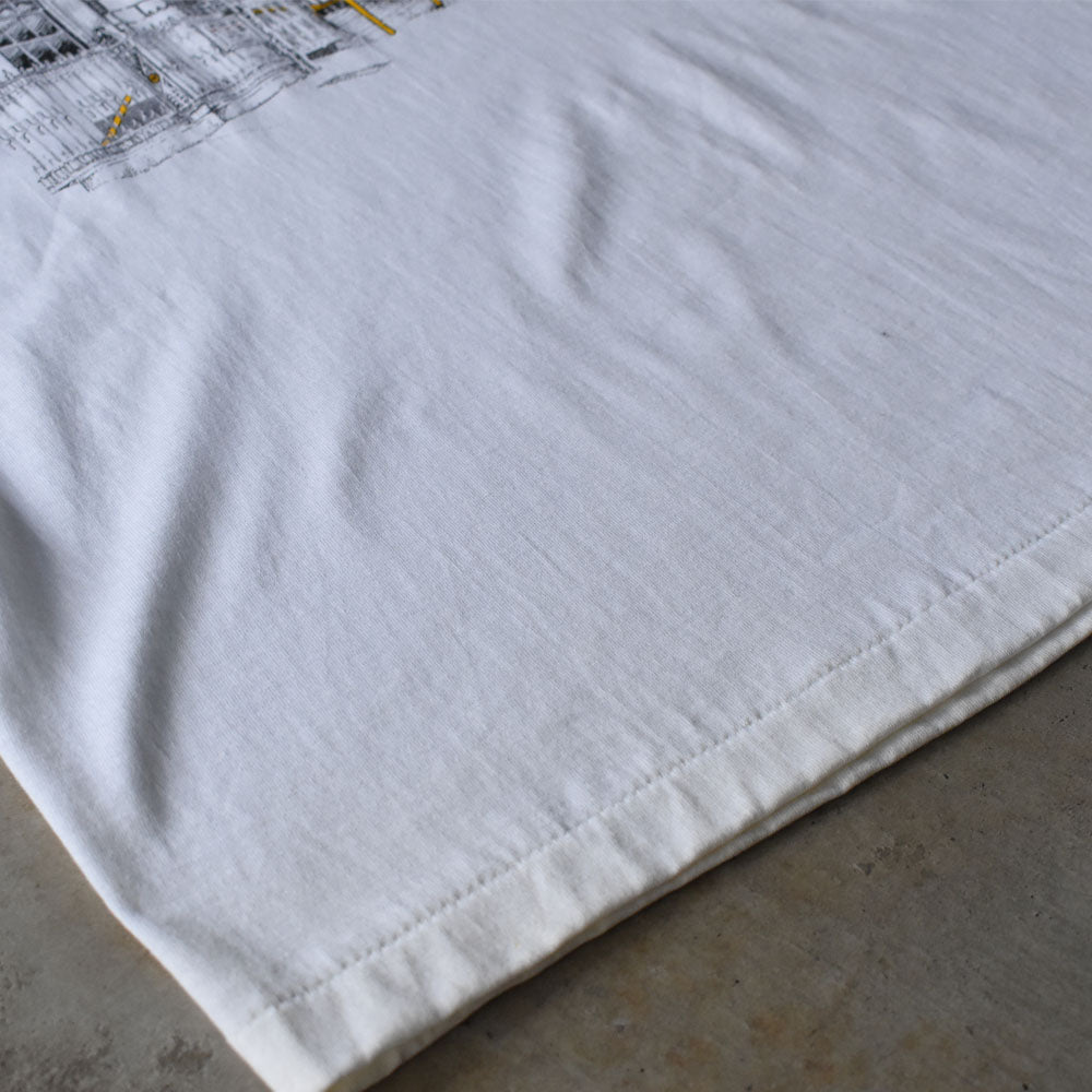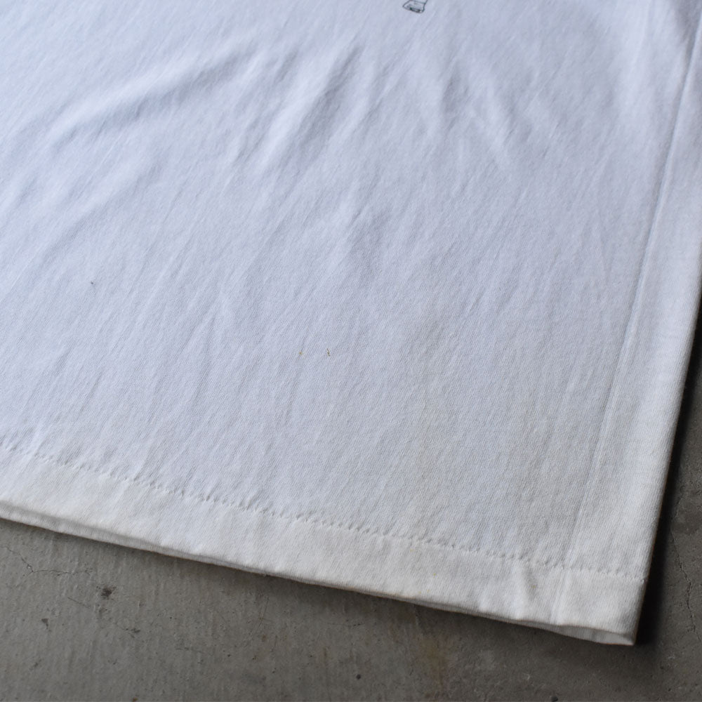 note...90年代、ボストンのバー“Cheers”をモチーフにしたプリントTシャツ。希少なタグ付きのデッドストック品です。 レトロな筆記体ロゴと、線画で描かれた店舗のグラフィックが印象的。アメリカの人気ドラマ『Cheers』の舞台にもなった実在のバーで、ローカルみやげ的な空気感が絶妙に今っぽい1枚かと。 表記XLの大きめサイズに、袖・裾シングルステッチ。抜け感のある古着らしいトーンに、ちょっと洒落の効いたグラフィックがうまく馴染んでます。