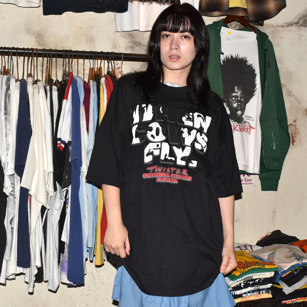 フロントには“WHEN COWS FLY”のメッセージを立体感のある発砲プリントで大胆に表現し、赤字で刻まれた「TWISTER / UNIVERSAL STUDIOS FLORIDA」の文字がアクセントになっています。