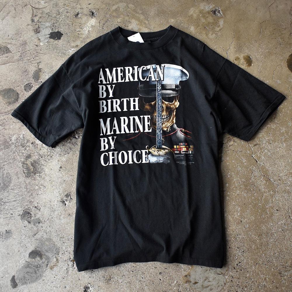 note...3D EMBLEM、スカルミリタリー Tシャツ。“AMERICAN BY BIRTH MARINE BY CHOICE” のスローガンと海兵隊のスカルグラフィックがプリントされた、インパント抜群の1枚。92年コピーライト入り。タグは3D EMBLEM社製。USA製のXL表記。コットン100%。海外でもコレクターの多い3D EMBLEM ヴィンテージTシャツです。
