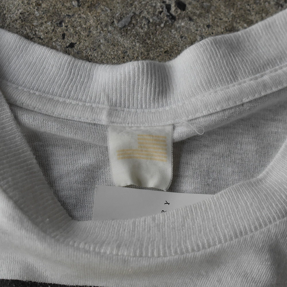 袖と裾はシングルステッチ仕様、ボディは国旗タグが付いたアメリカ製で、90年代当時のディテールがうかがえます。ヴィンテージならではの風合いと希少性を兼ね備え、音楽・デザイン・社会的メッセージが交差した1990年ヨーロッパの時代精神を体現する、コレクター垂涎のアーカイブピースです。