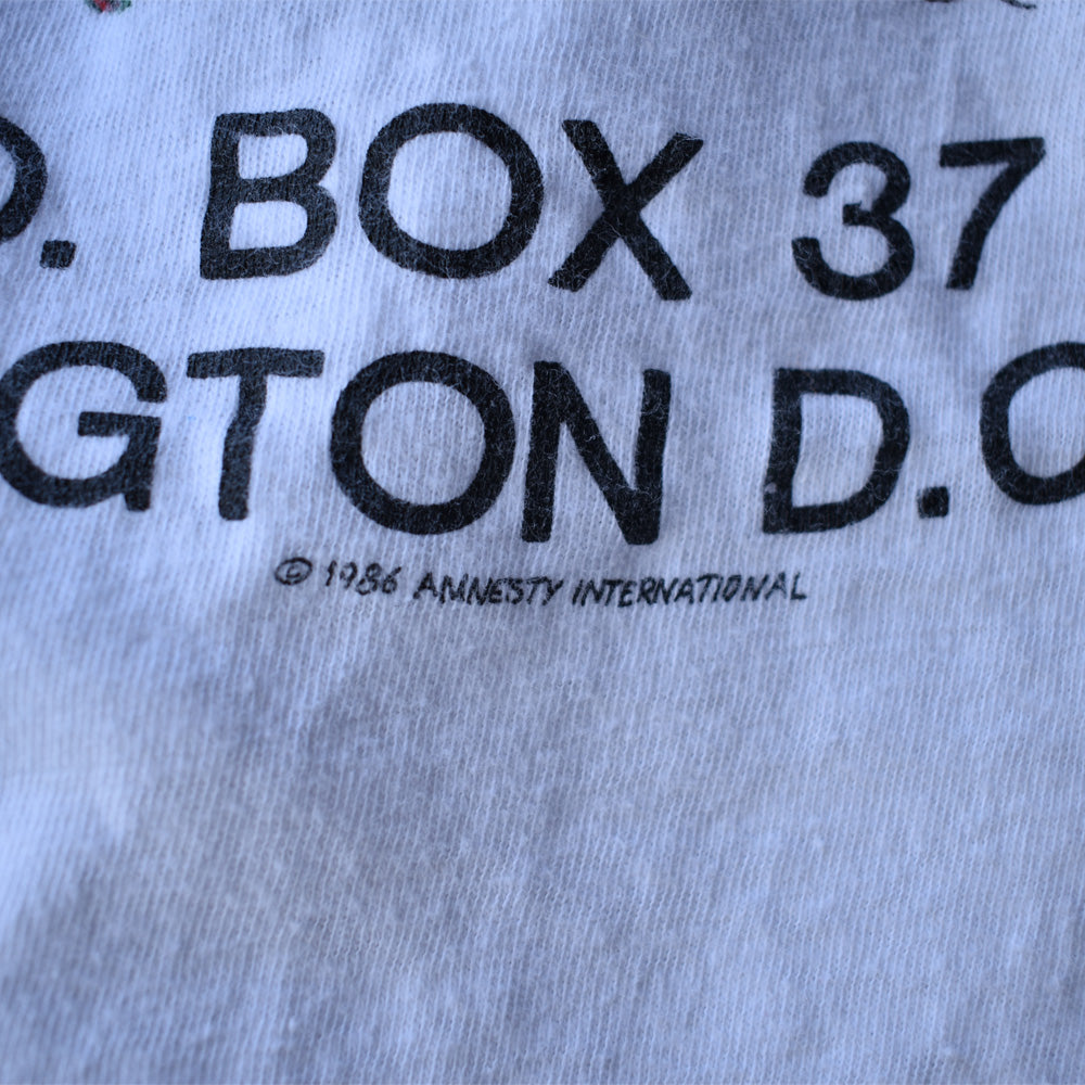 note...1986年、アムネスティ・インターナショナル創立25周年を記念して開催されたチャリティ・ツアー「A Conspiracy of Hope」。本Tシャツは、同年6月にアメリカ各地で行われた全6公演のオリジナルグッズです。ボディはUSA製SCREEN STARS、袖・裾ともにシングルステッチ仕様。