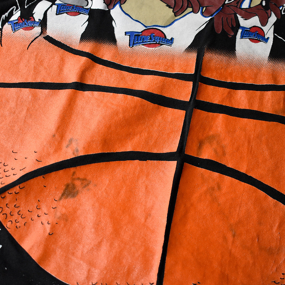 note...US実写アニメーション、マイケル・ジョーダンとルーニー・テューンズのスポーツコメディムービー、SPACE JAM。お馴染みのキャラクター達が集結した、豪華AOP(オールオーバープリント)Tシャツ!巨大なバスケットボールと星座のようなラインアートが重なる、アート性の高い1枚。97年ワーナーブラザースコピーライト入り。スペシャルピース、SPACE JAM Tシャツです!
