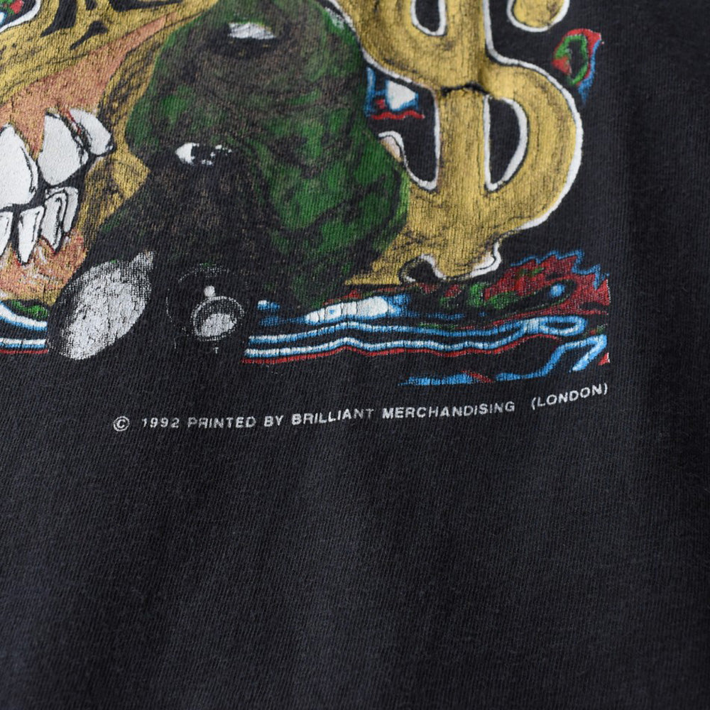 フロントのアートワークは、コラージュのように混ざり合う世界観が印象的。十字架や溶けたドクロ、歪んだ象徴の数々が、ただのショック表現ではなく、当時の社会不安そのものを映しているように見えます。黒コットンに染み込んだインクのひび割れも程よく、時間がつくる深さがきれいに残っている。