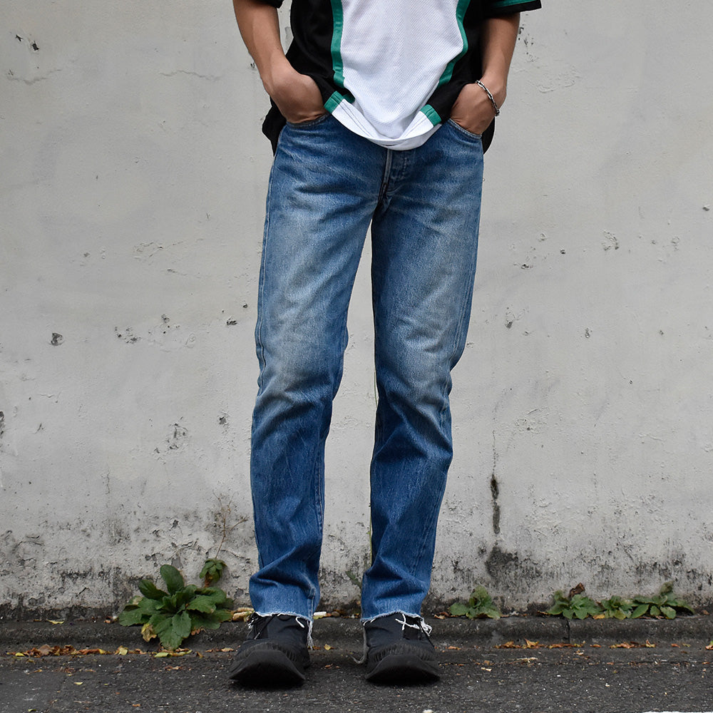note...Levi'sの王道ストレートシルエット、501デニムパンツ。ここ数年人気を集めているユーロタイプのフランス製。色落ちと美しいヒゲの入りが完璧。実寸ウエストサイズは30インチ位。フルシーズン大活躍の1本です。