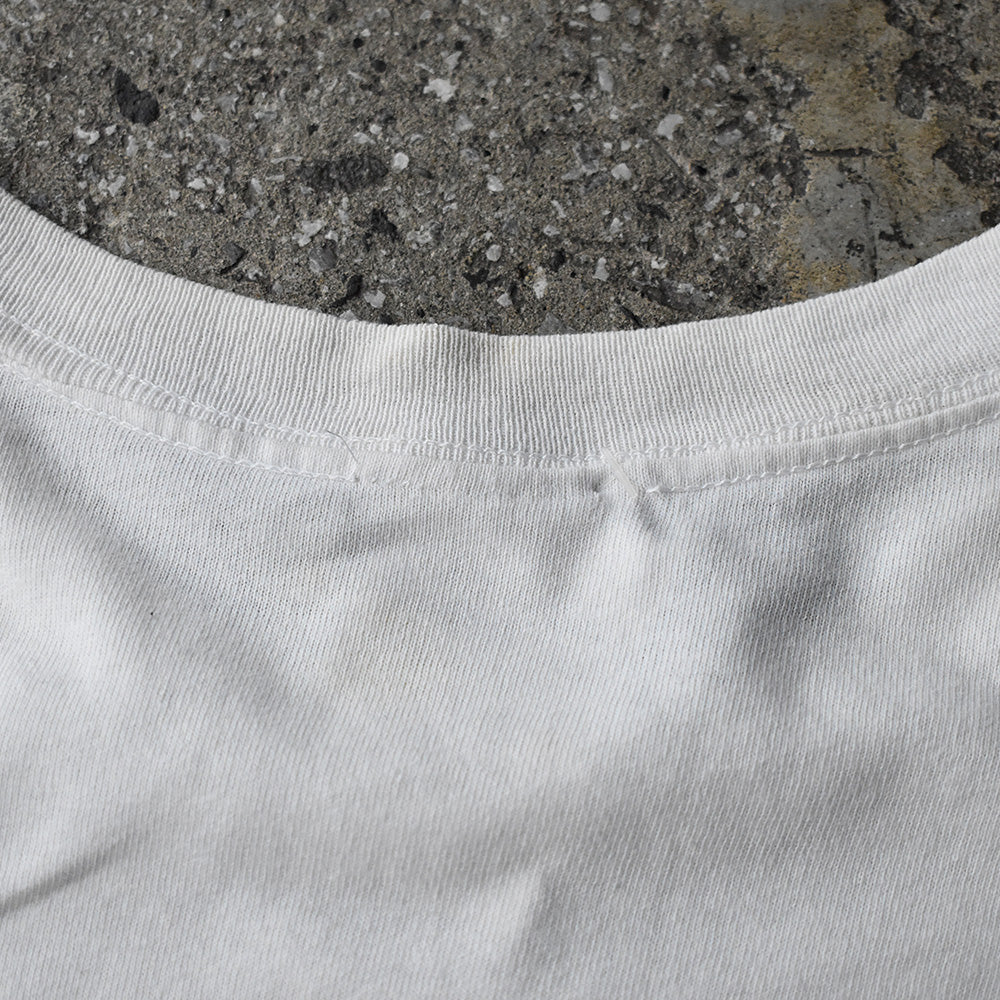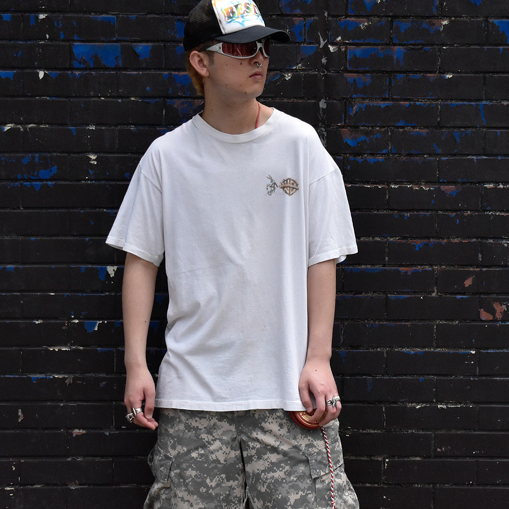 note...ワーナー・ブラザース配給、93年公開の名作映画、“Free Willy“ Tシャツ。名シーンのウィリーが少年を飛び越える瞬間をリアルに再現したグラフィック。“How far would you go for a friend?“のキャッチコピーも心に刺さるエモーショナルな1枚。フロント胸元にはワーナーブラザースのロゴとバッグス・バニーがプリントされています。90'sカルチャー好き、映画好きに堪らないアイテムです。