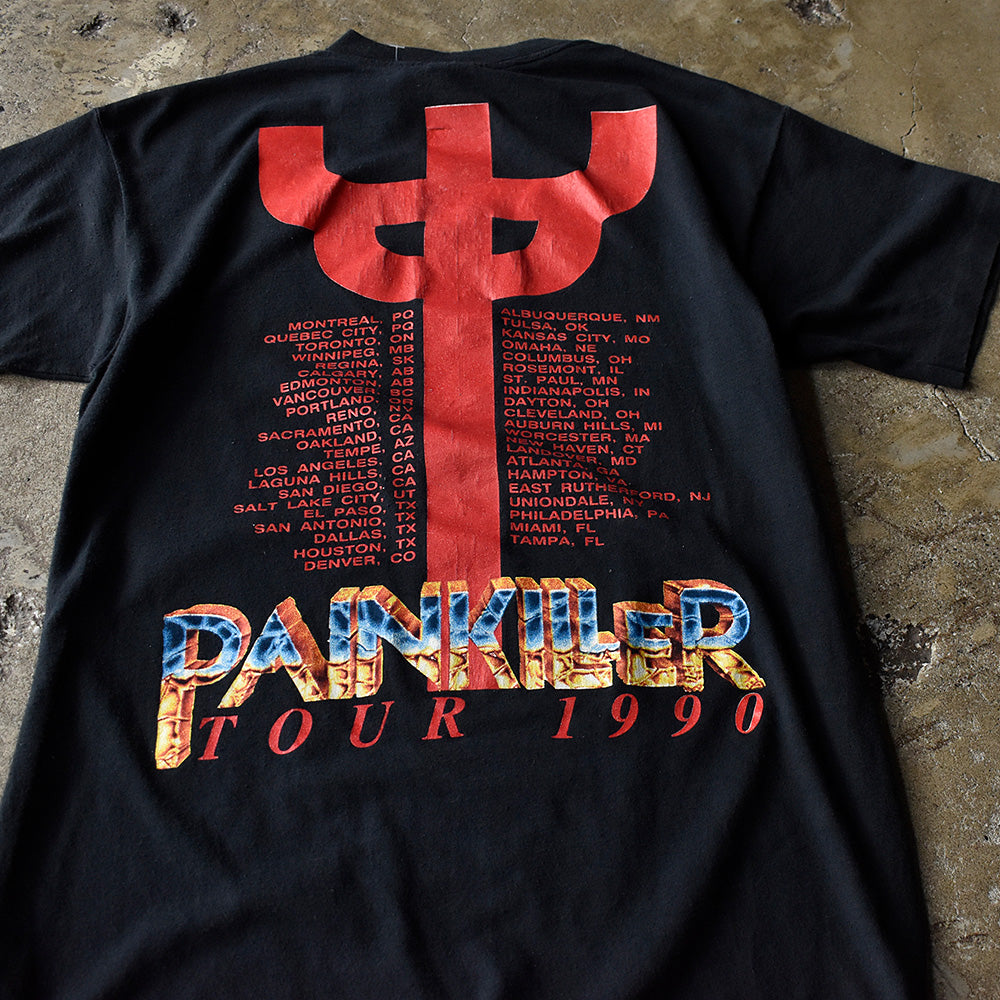 note...世界的人気を誇るイングランドのヘヴィメタルバンド、ジューダス・プリースト。90年リリース“Painkiller“1990ツアーTシャツ。フロントにアルバムジャケットの圧巻なメタルアートワーク!バックにはツアー開催地がプリントされています。90年コピーライト入り。メタルファンの方必見、ヴィンテージ、ジューダス・プリーストTシャツです。