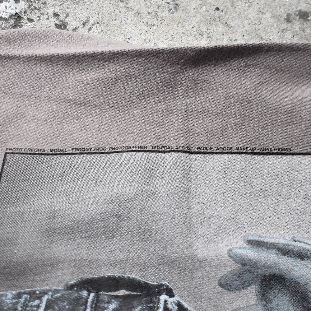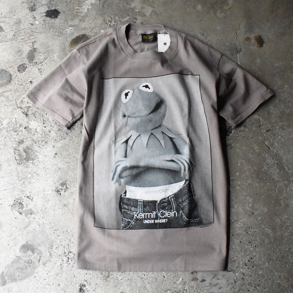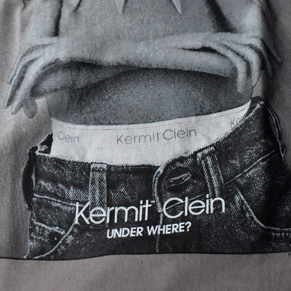 note...お探しの方も多い、カーミット、カルバンクラインパロディTシャツ!可愛いカーミット×CKアンダーウェアのパロディ広告が目を引く一枚!ボディカラーは珍しいオリーブグレーカラー。ジムヘンソンコピーライト入り。M表記のUSA製。袖、裾シングルステッチです。