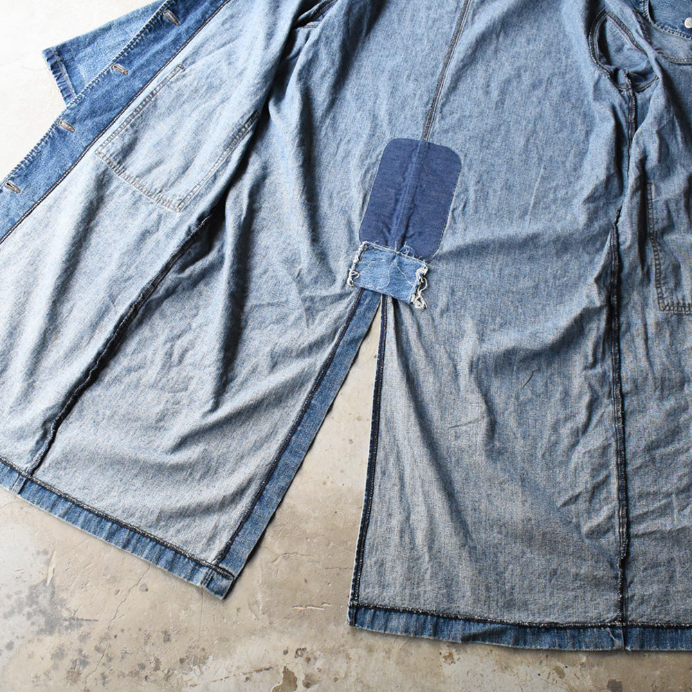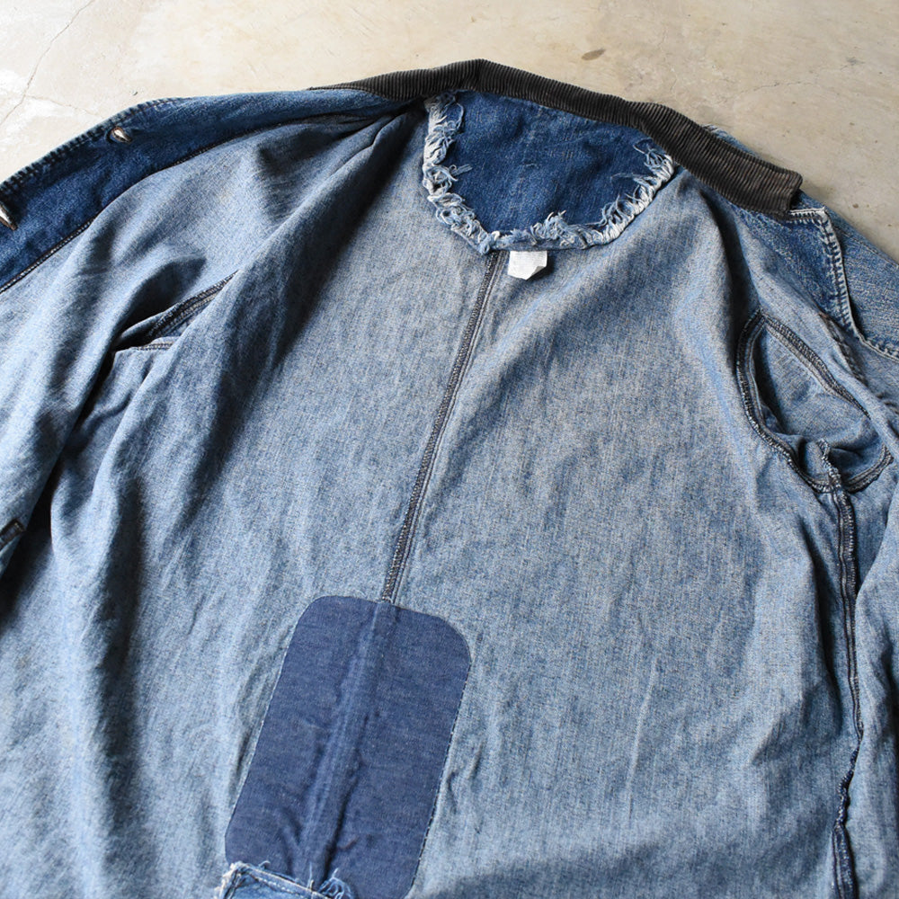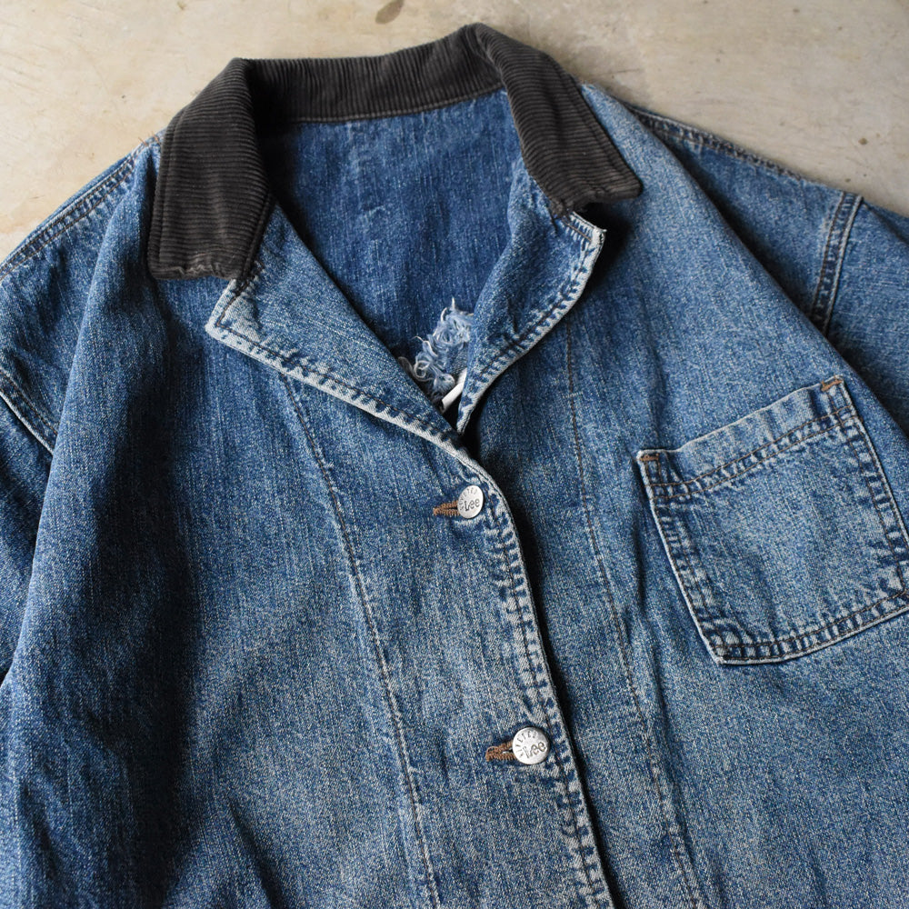 note...90年代にLeeが展開していた“Riveted”ラインのデニムワークコート。XLサイズならではの迫力あるロング丈が魅力の一着。フェード感のあるデニムに、コーデュロイ襟といったクラシカルなディテールが映える本格派。縦長シルエットを活かしてロングブーツや太めのパンツと合わせた無骨なレイヤードもおすすめ。雰囲気系のデニムアイテムをお探しの方に!