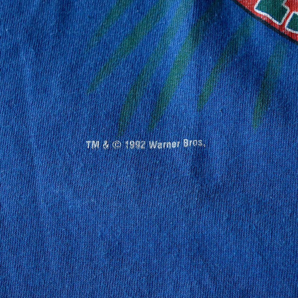 note...人気USアニメ、ルーニー・テューンズ。登場キャラクター、シルベスター・キャットTシャツ。鮮やかなブルーボディに、可愛いシルベスターのフェイスプリント。92年コピーライト入り。袖、裾シングルステッチ。USA製。キャラクター好きには堪らない1枚です。